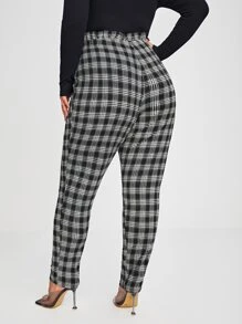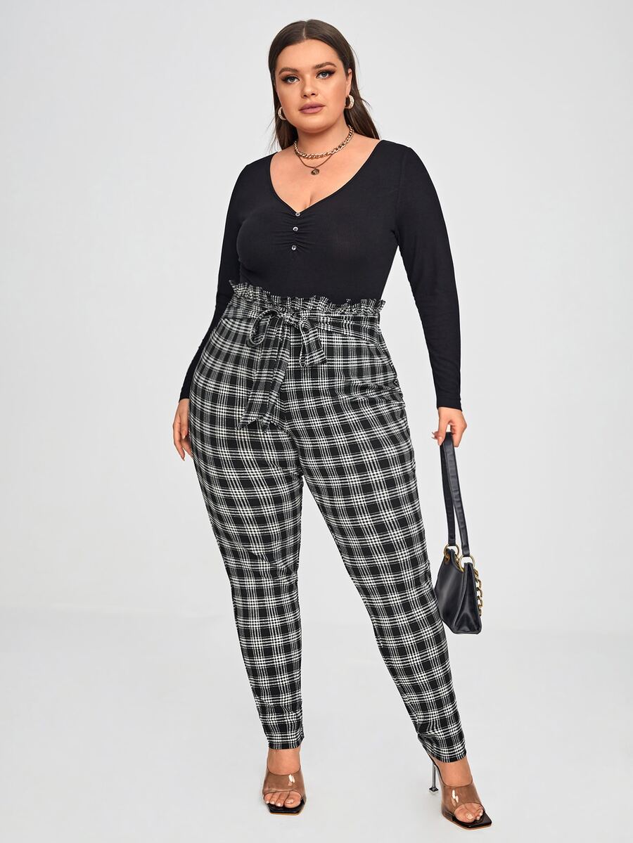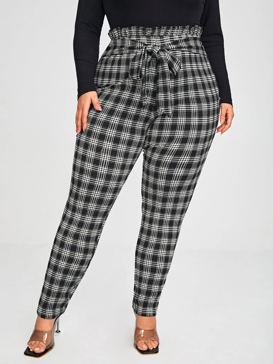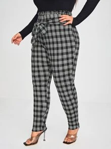 Plus Plaid Print Belted Paper Bag Waist Pants