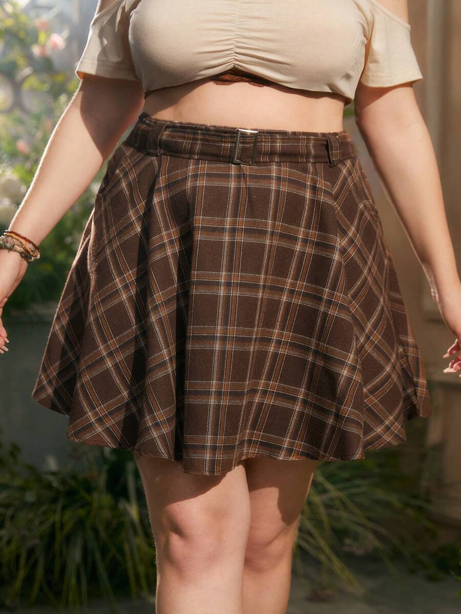 Fairycore Plus Plaid Print Belted Skirt