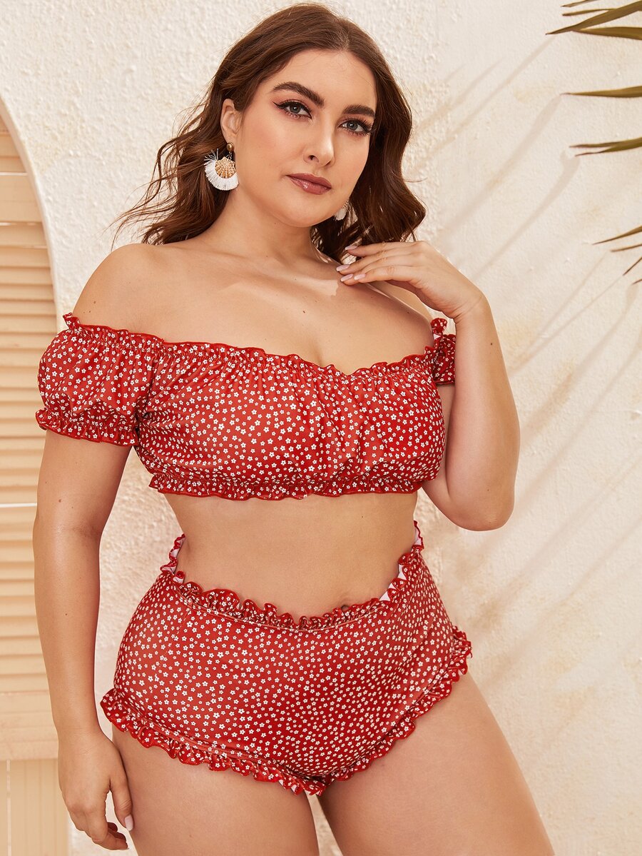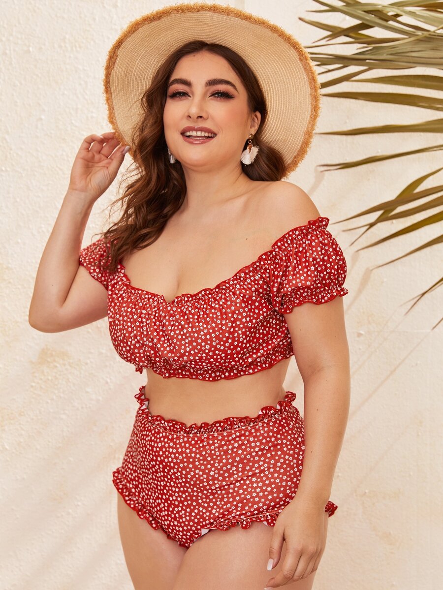 Plus Polka Dot Bardot Top With High Waisted Bikini