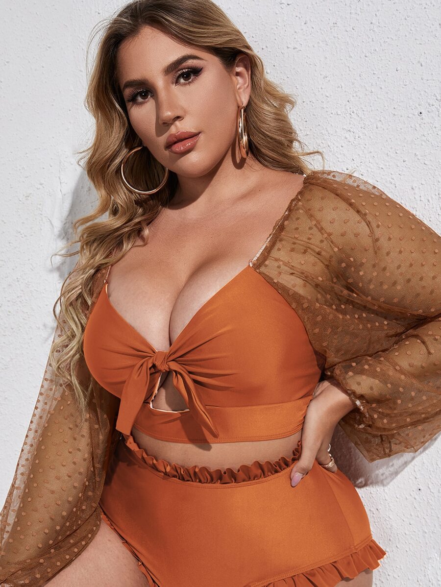 Summer Plus Size Dobby Mesh Panel Long Sleeve Knot Front Lace Up Back Bikini Top Without Shorts