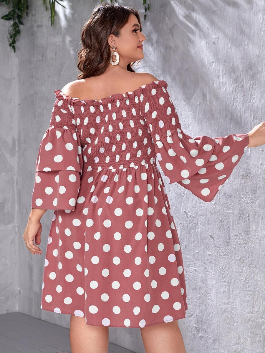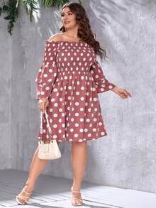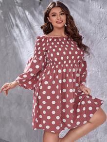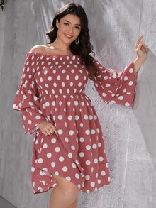 Plus Polka Dot Shirred Off Shoulder Layer Sleeve Dress
