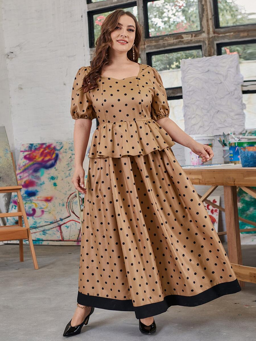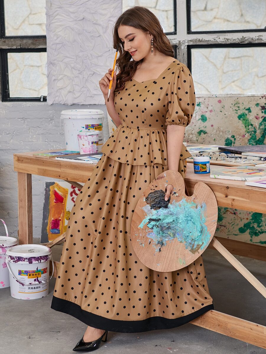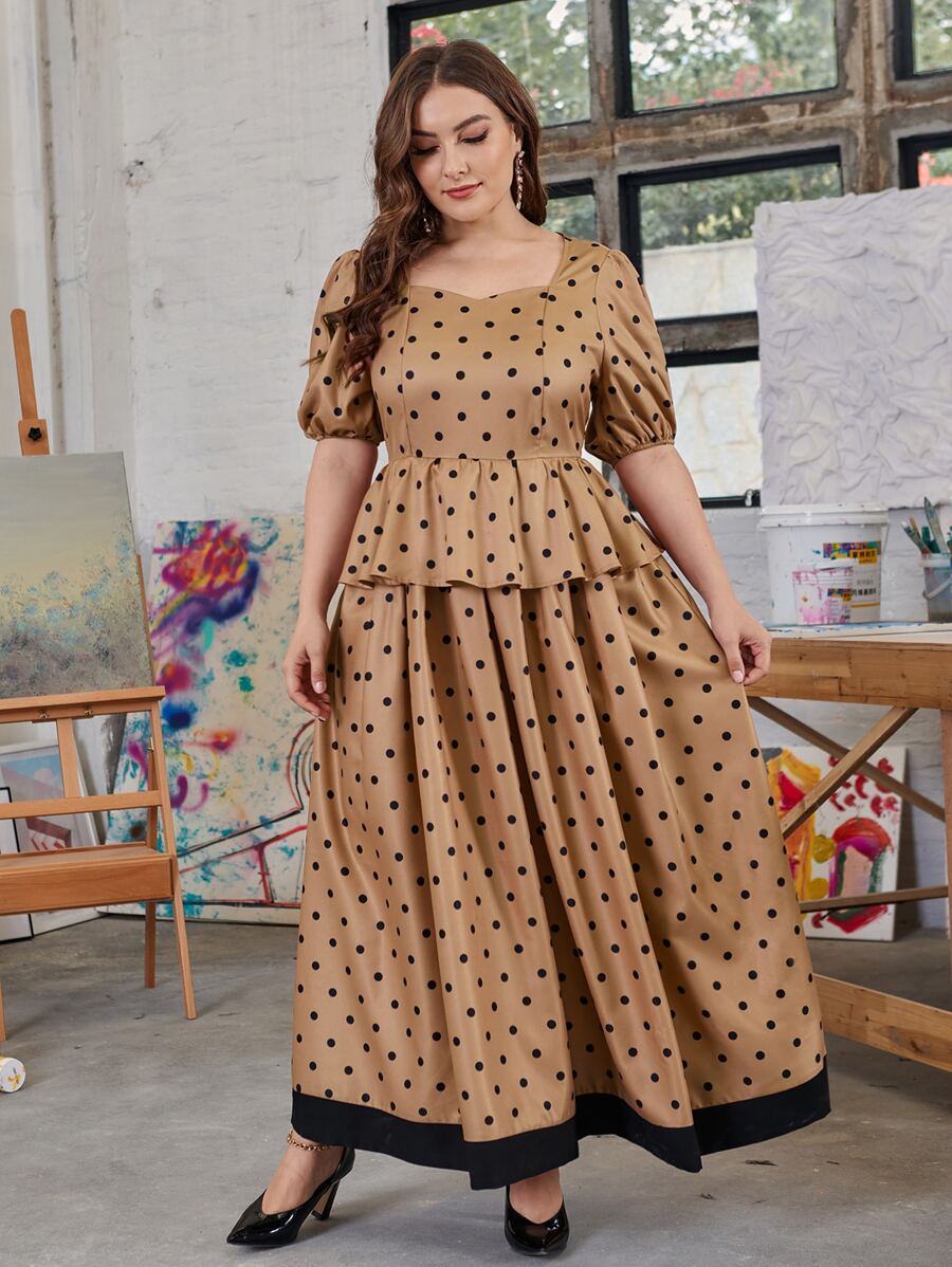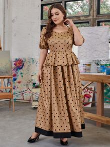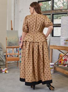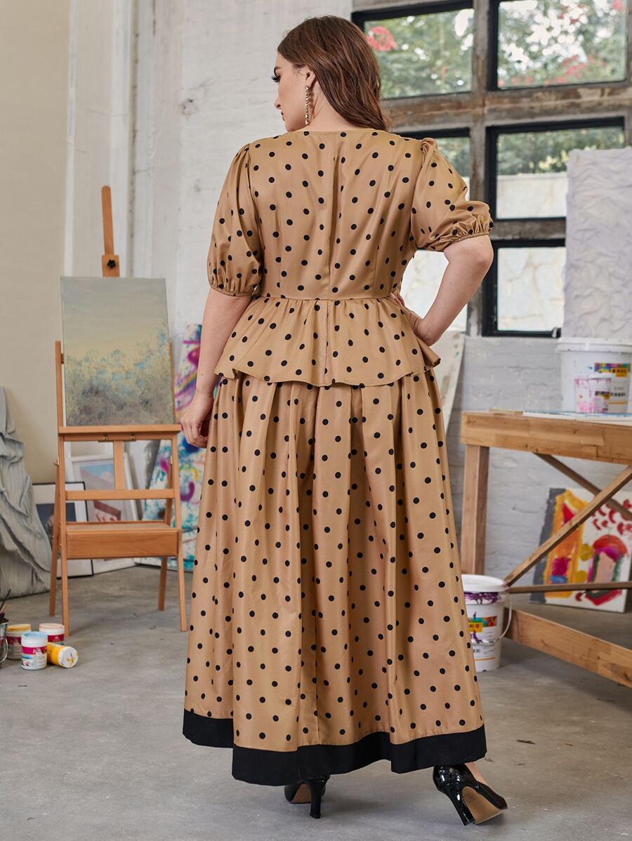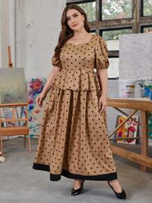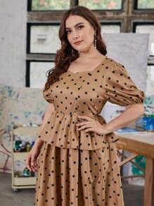 Plus Puff Sleeve Polka Dot Peplum Dress