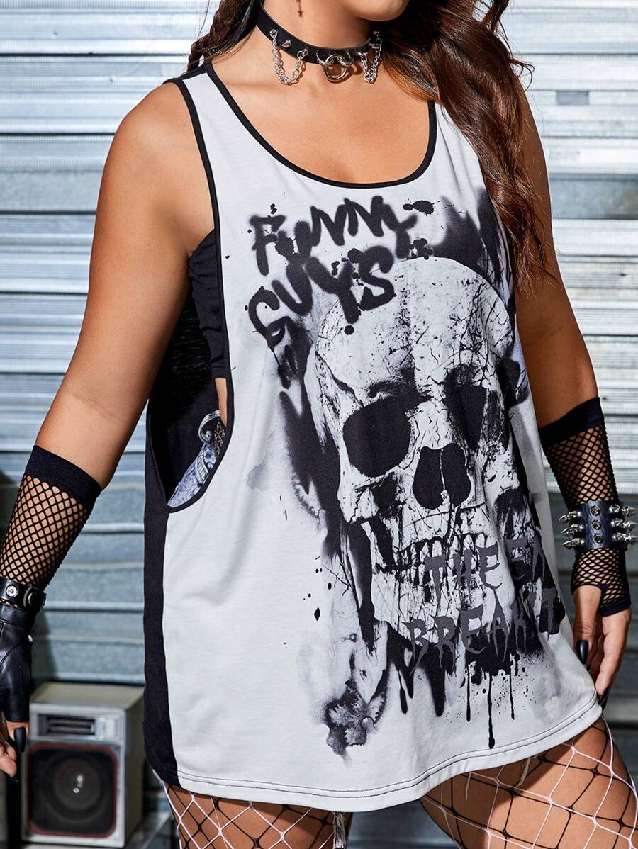 Plus Rock Skull Print Contrast Binding Tank Top, School, Summer