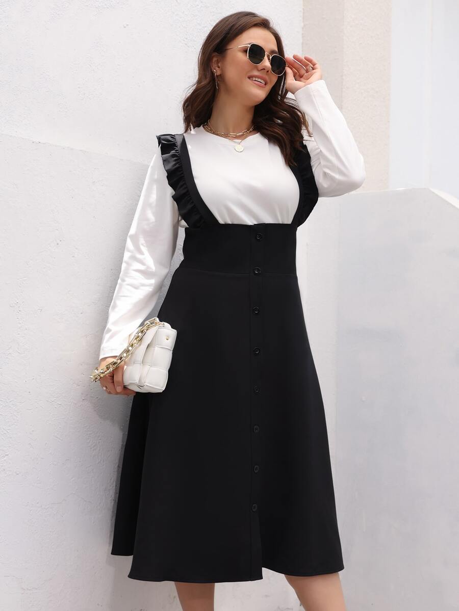 Plus Ruffle Trim Button Front Overall Dress Without Tee