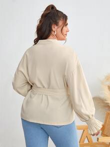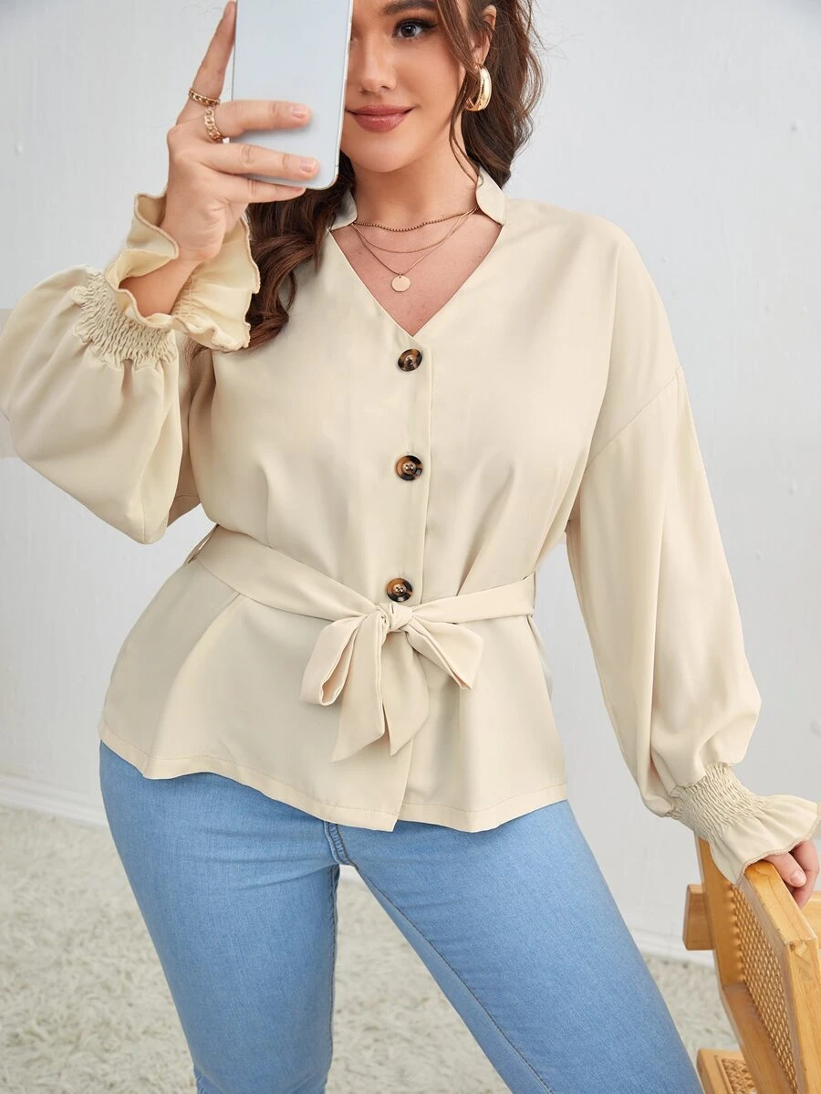 Plus Shirred Flounce Sleeve Button Front Belted Blouse