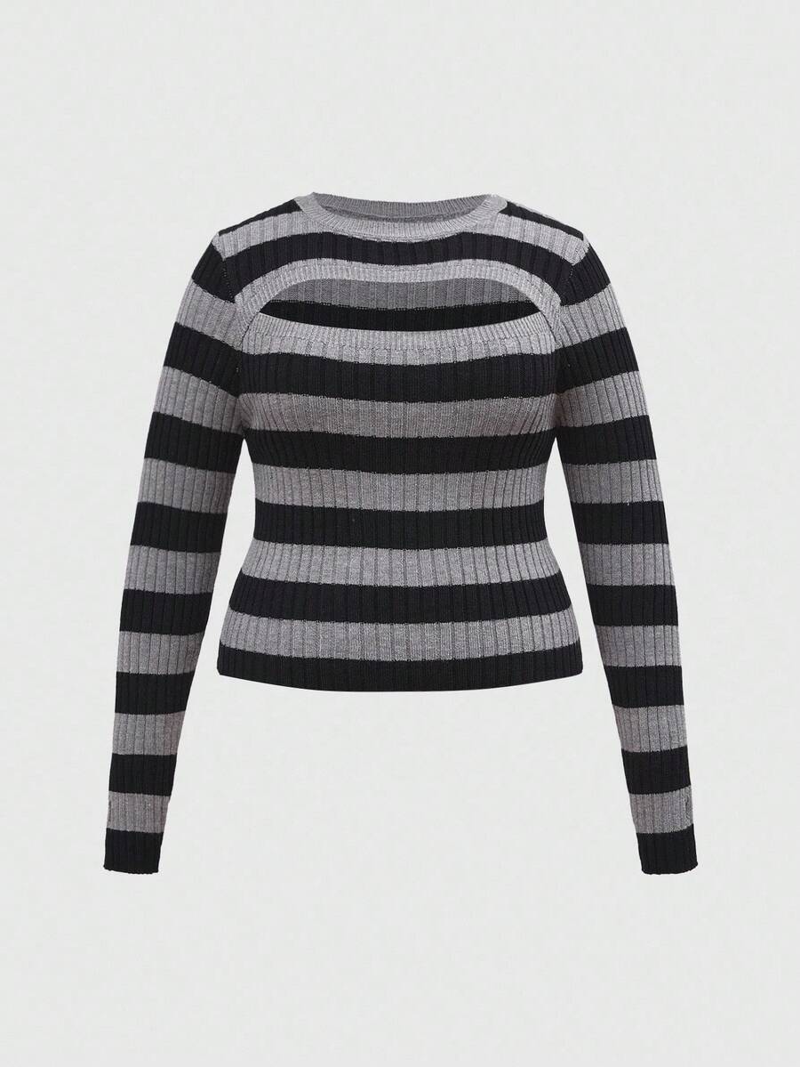 Plus Size Crew Neck Hollow Out Chest Design Black & Gray Striped Long Sleeve Knit Pullover, Casual Wear For Autumn/Winter