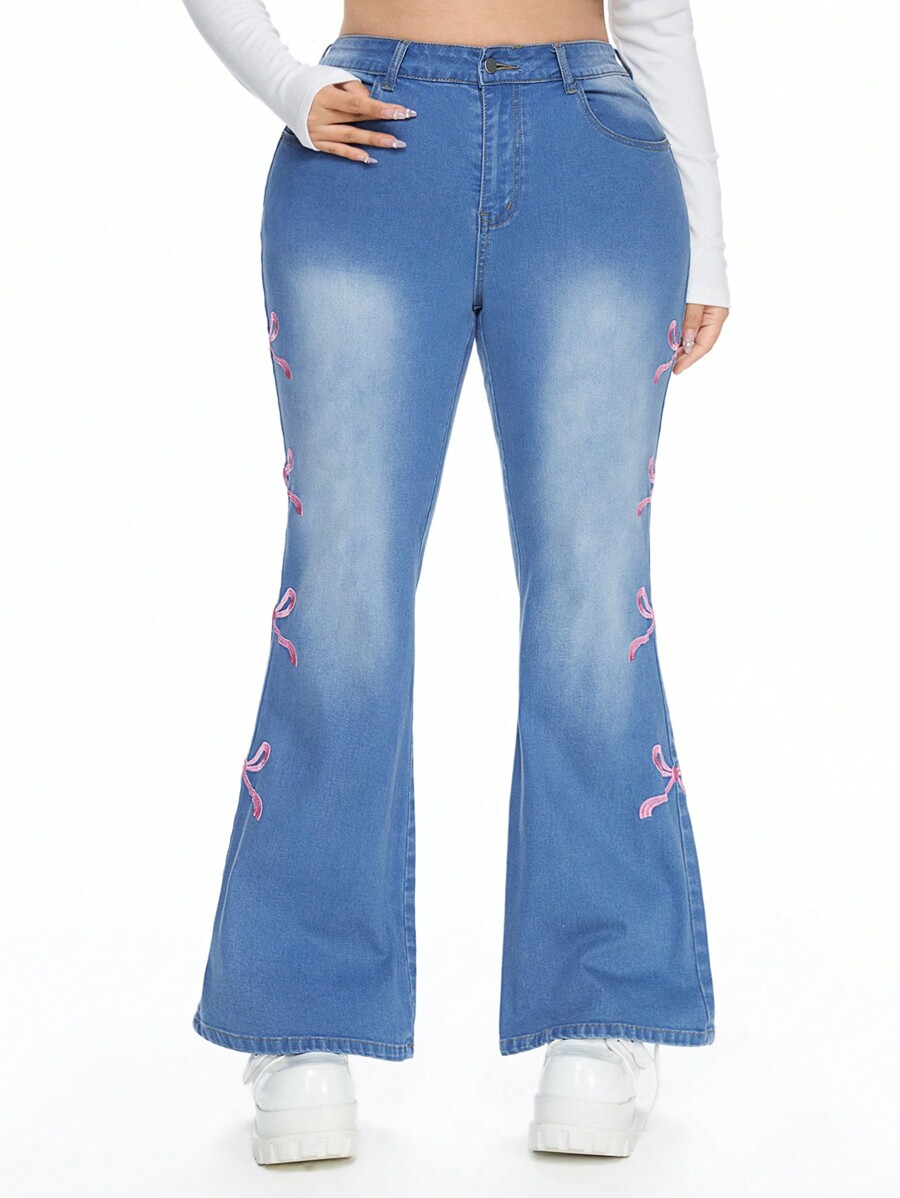 Kawaii Plus Size Cute Bow Embroidered Fitted Flare Jeans