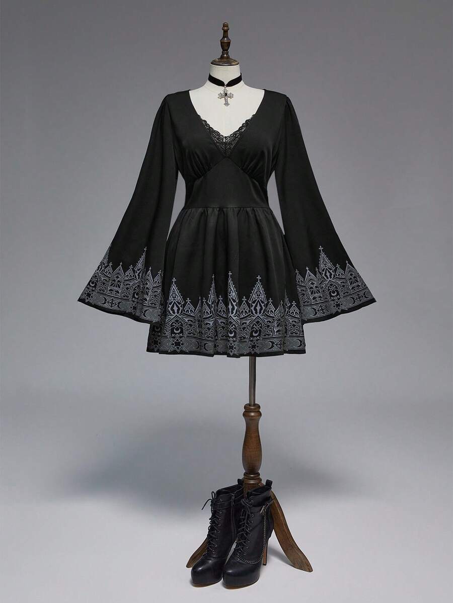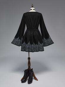 EDITION Plus Size Dark Castle Print Halloween Outfit Flare Sleeve Dress