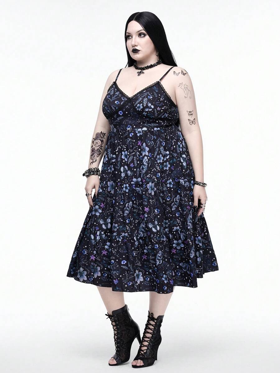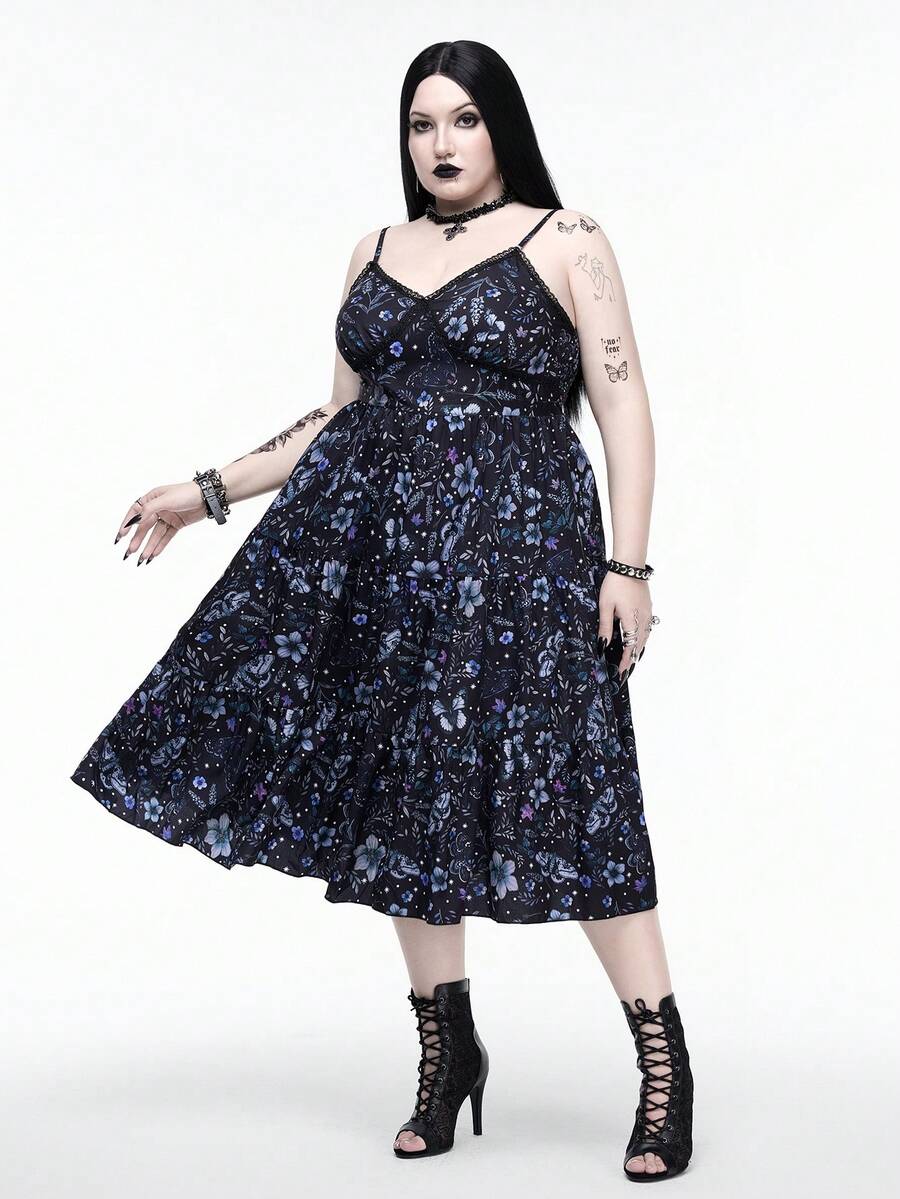 Goth Plus Size Dark Purple Moth Floral Print Maxi Slip Dress