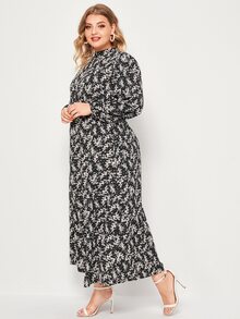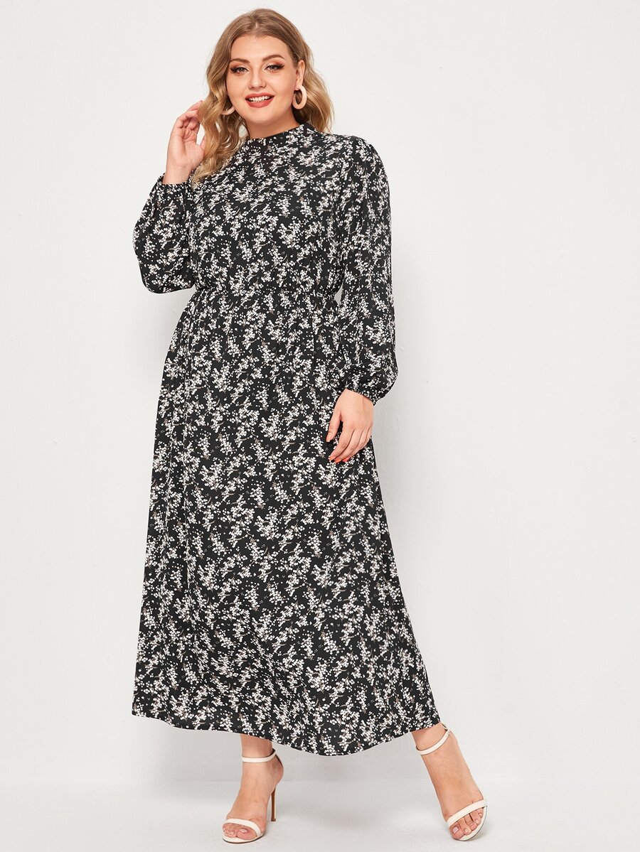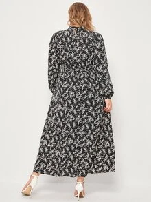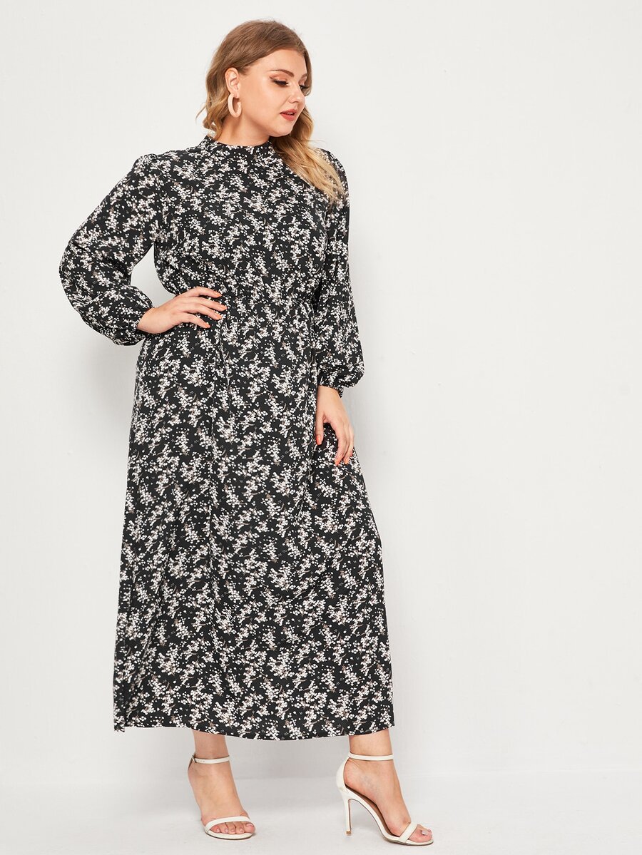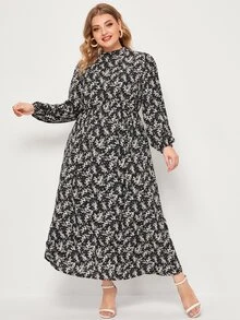 Plus Size Ditsy Floral Print Mock-Neck Lantern Sleeve Dress