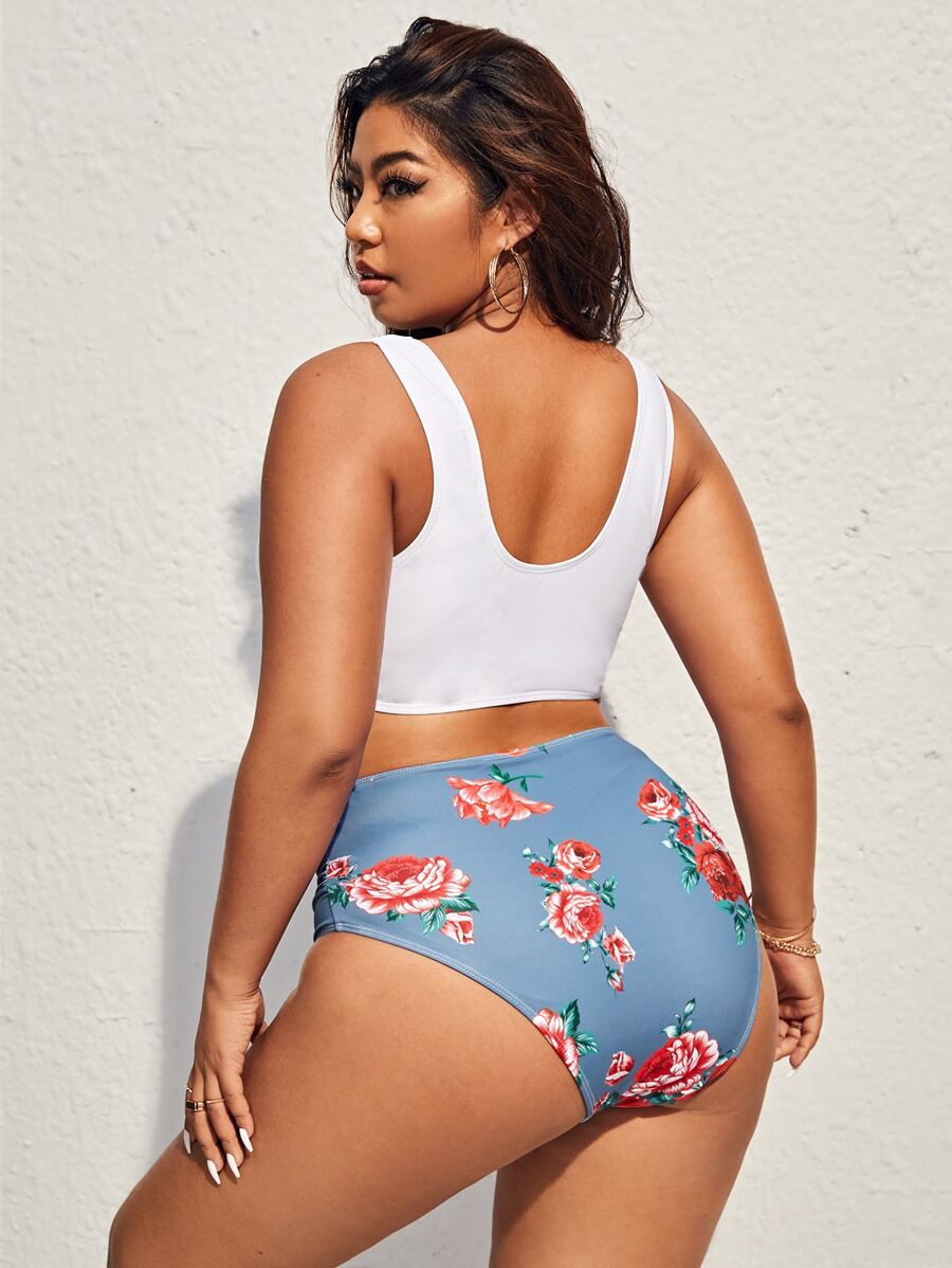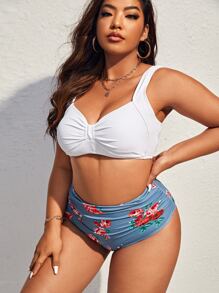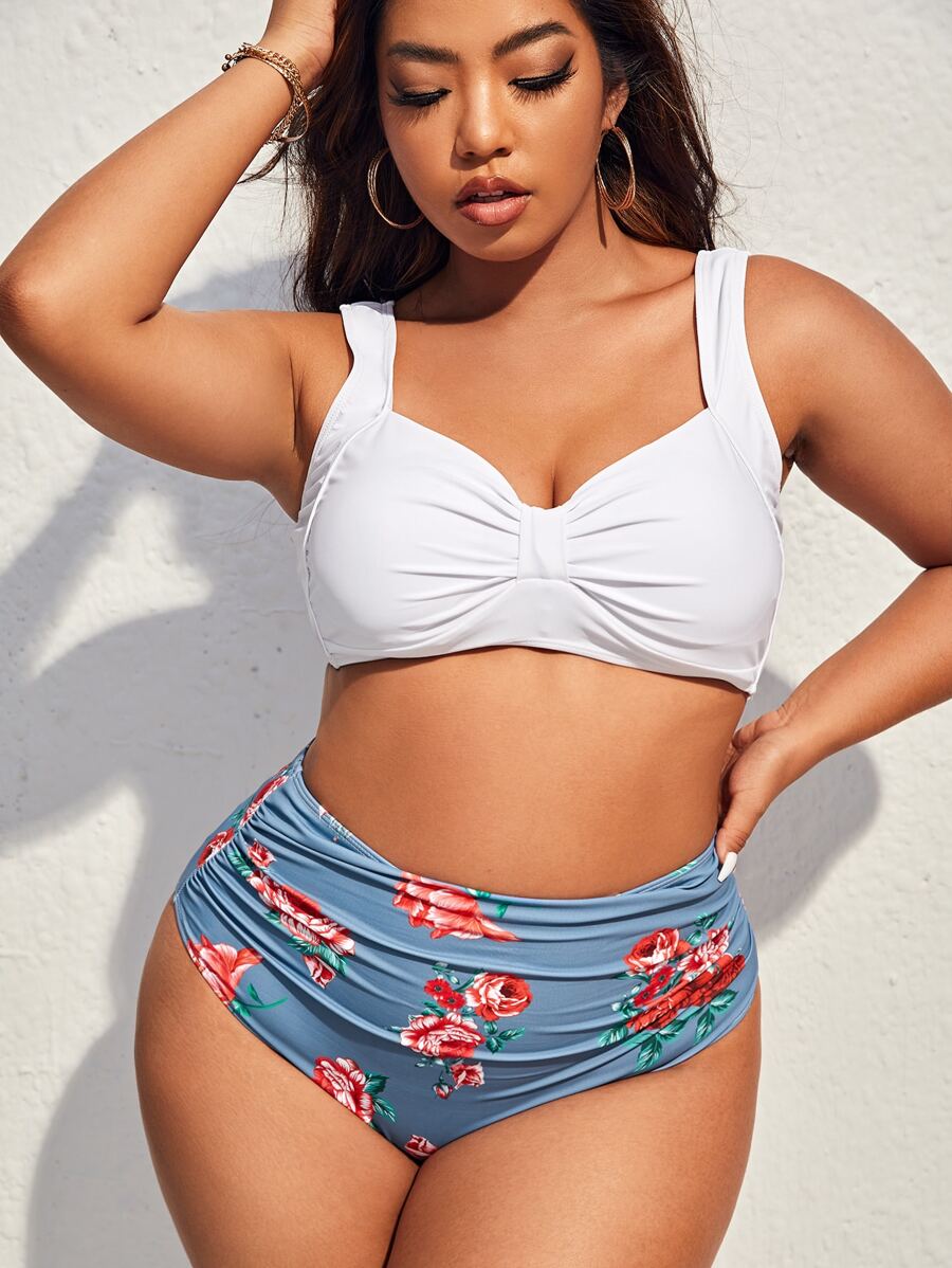 Plus Size Floral Print Ruched Bust Bikini Set Summer Beach