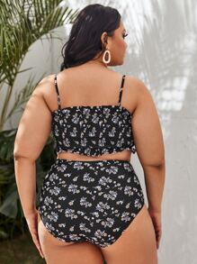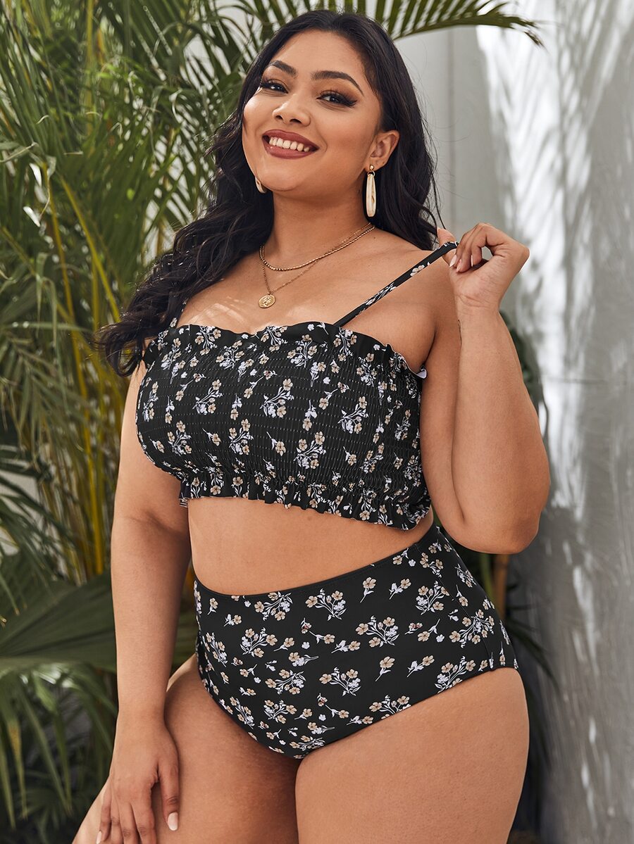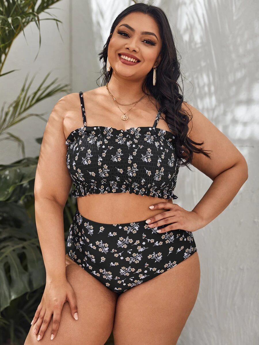 Plus Size Floral Smocked High Waisted Bikini Set Summer Beach