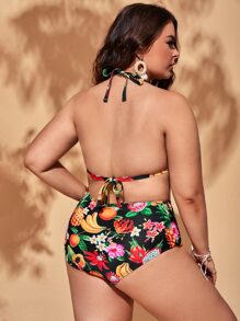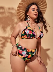 Plus Size Fruit Pattern Halter High Waisted Bikini Set Summer Beach