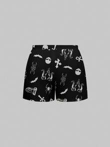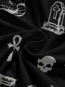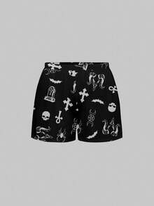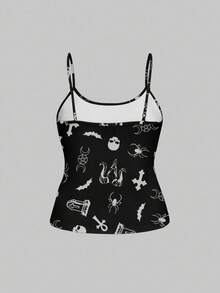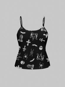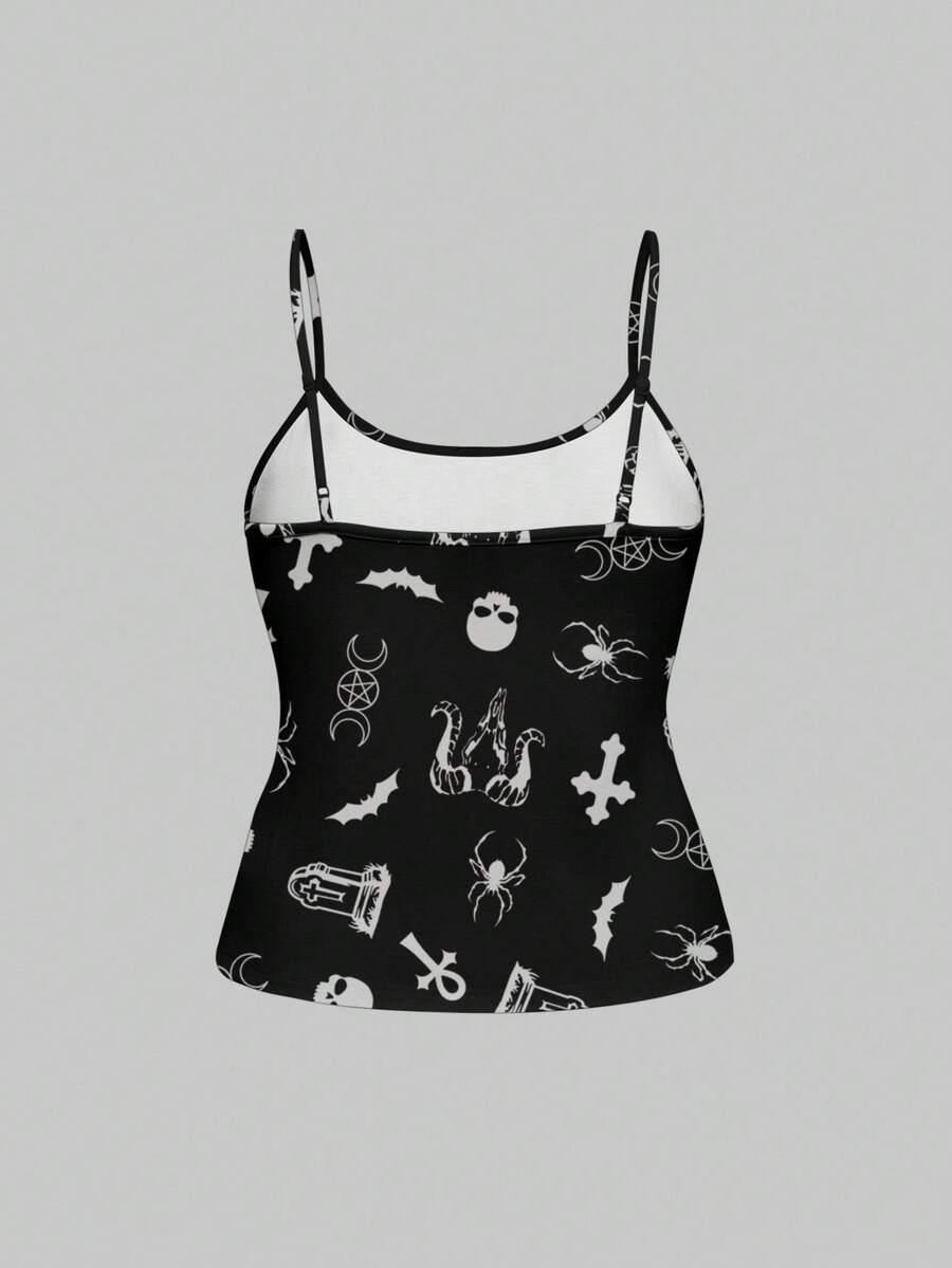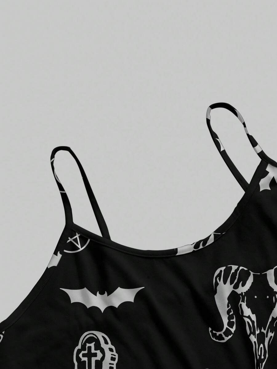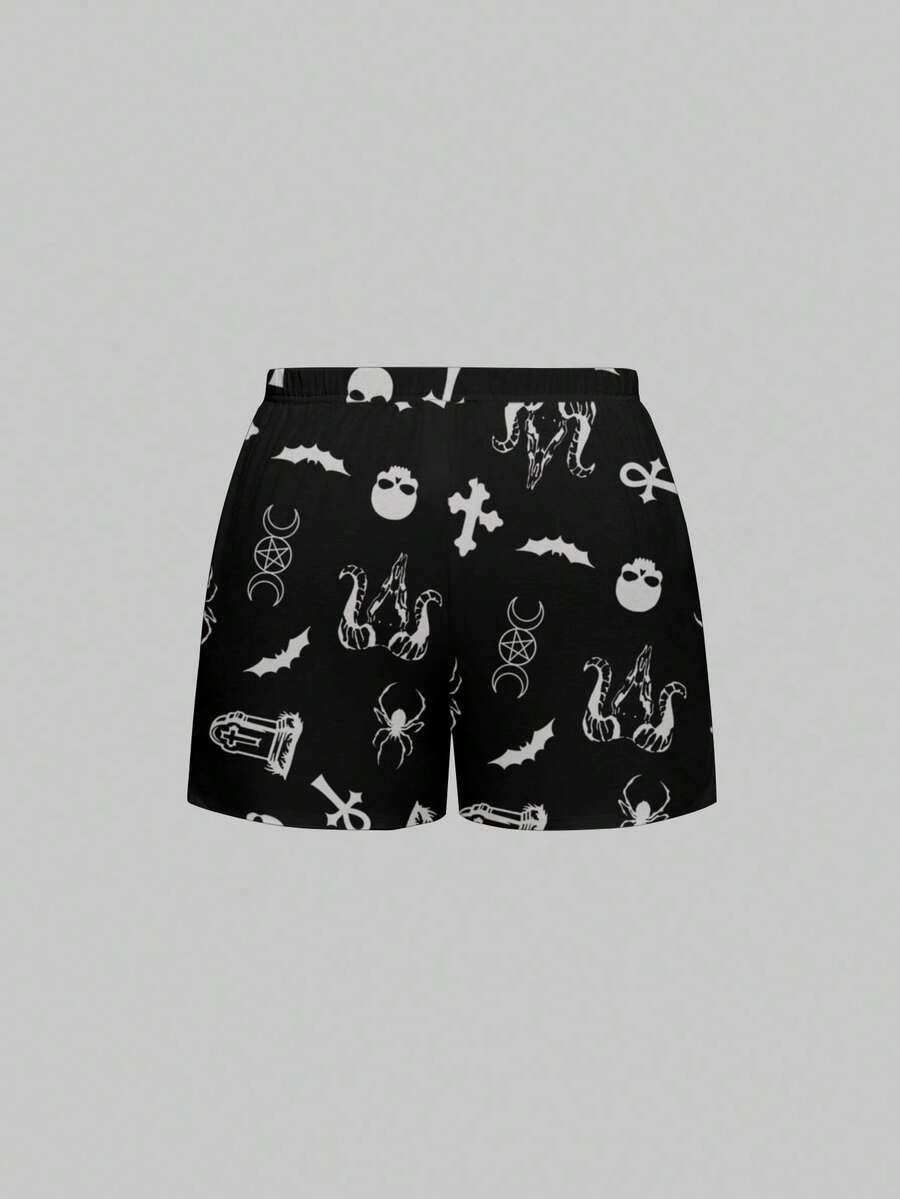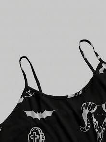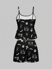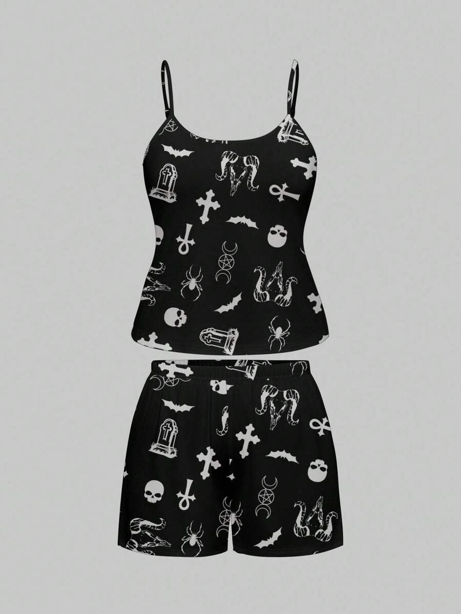 Plus Size Gothic Cross, Skull, Bat, Grave Allover Print Camisole & Shorts Pajama Set, Casual Loungewear