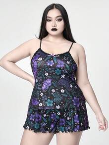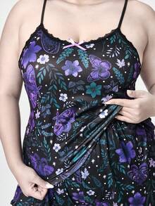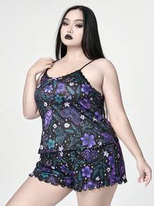 Plus Size Gothic Dark Moth, Plant, Butterfly, Floral Full Print Lace Bow Camisole & Shorts Pajama Set