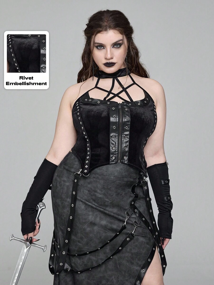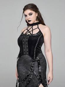 EDITION Plus Size Gothic Five-Pointed Star Element Spaghetti Strap Leather Rivet Webbing Vest, Plus Size Gothic Autumn/Winter Spaghetti Strap Top, Plus Size Gothic Christmas Autumn/Winter Camisole Vest, Plus Size Gothic Party Dinner Vintage Dark Ladies Spaghetti Strap Vest