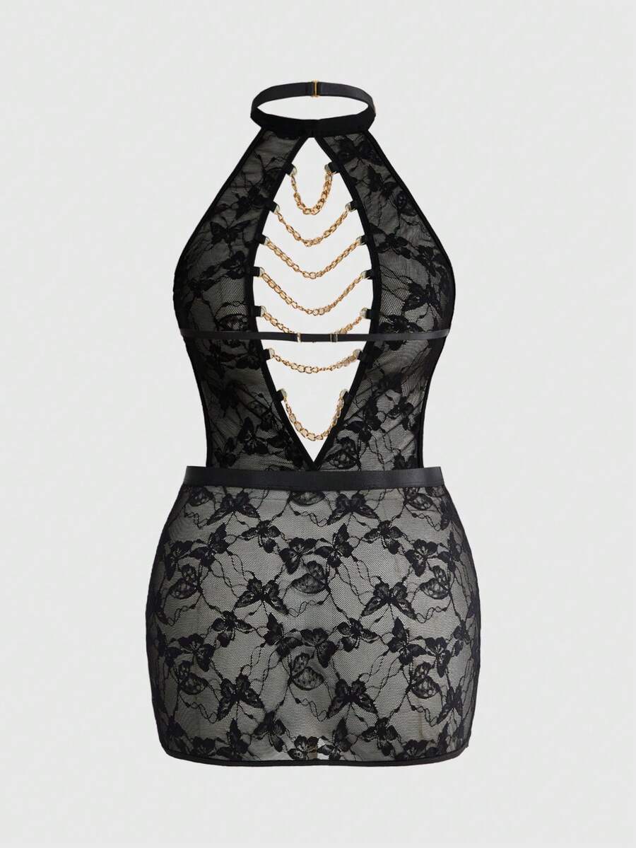 Plus Size Gothic Lace Floral Metal Chain Halter Sexy Bodycon Nightgown Lace