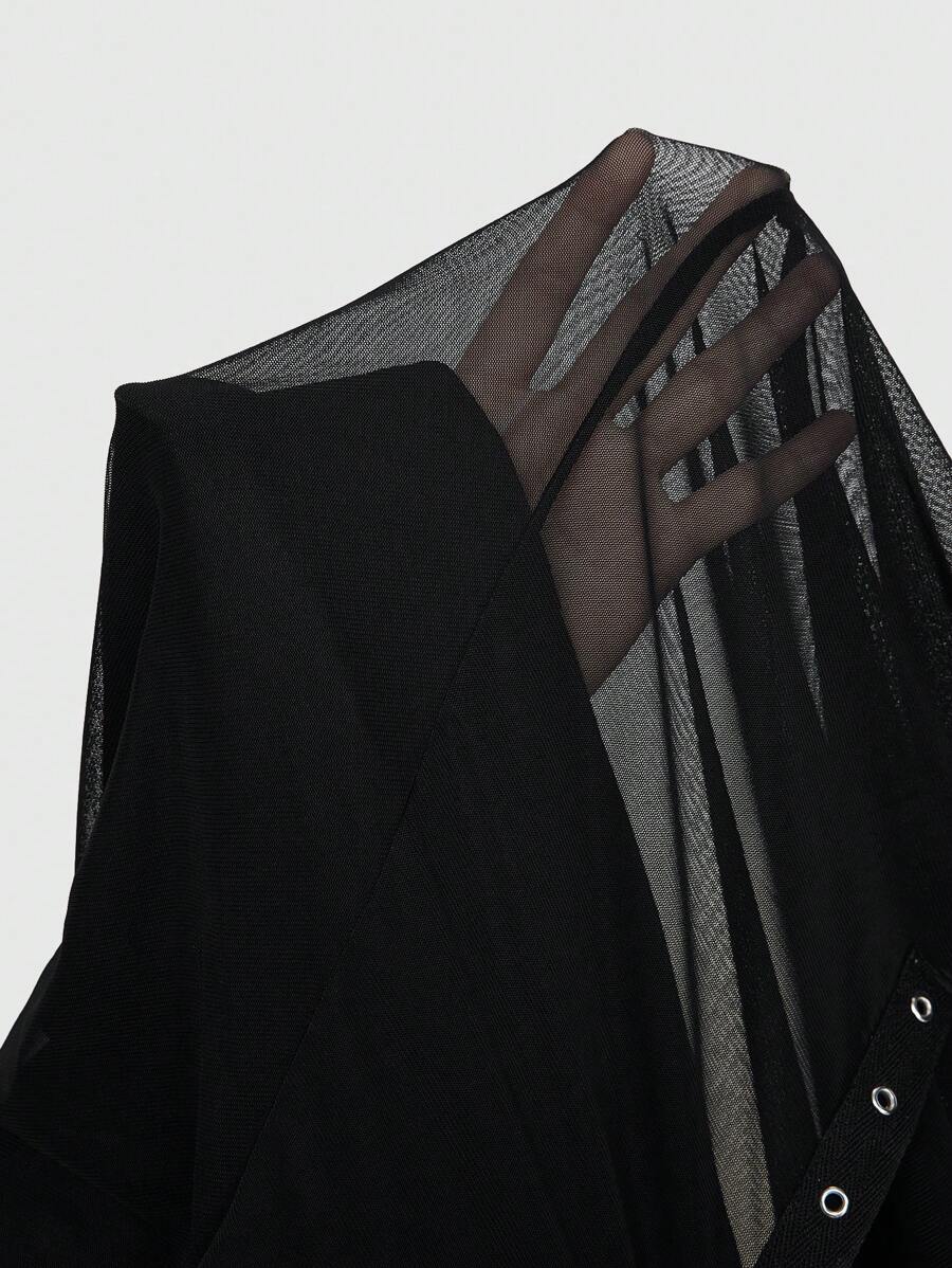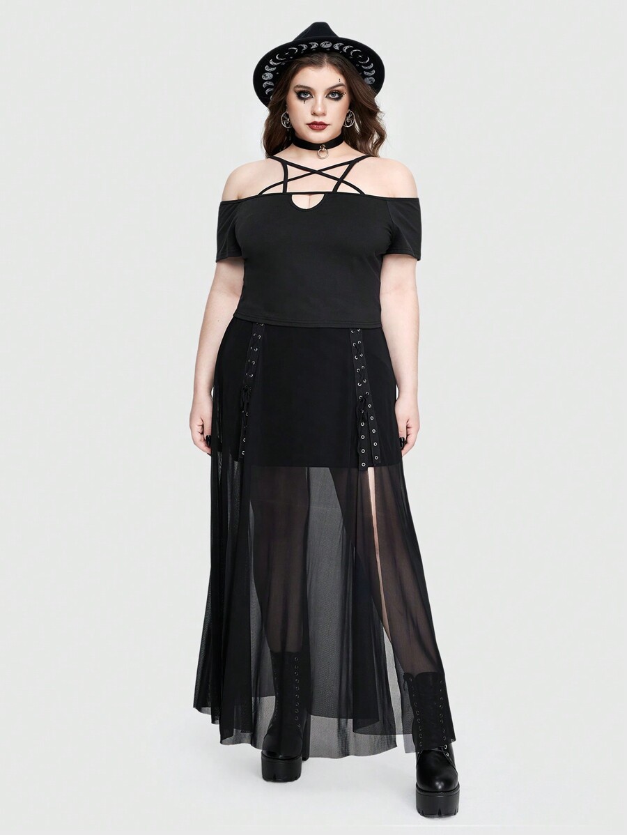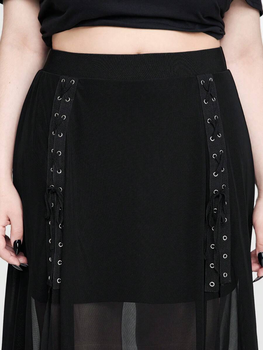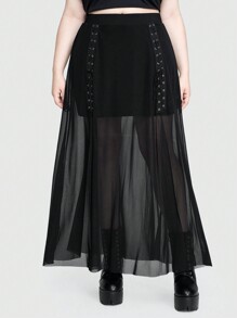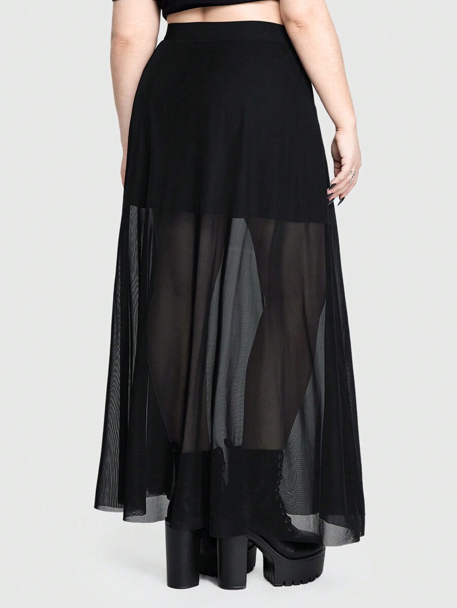 Plus Size Gothic Metal-Chain Strap High-Slit Sheer Mesh A-Line Skirt For Women