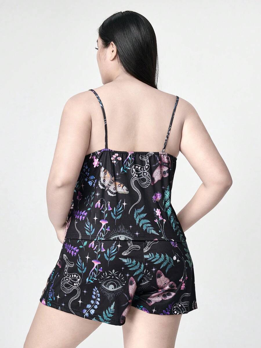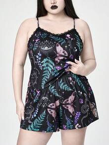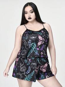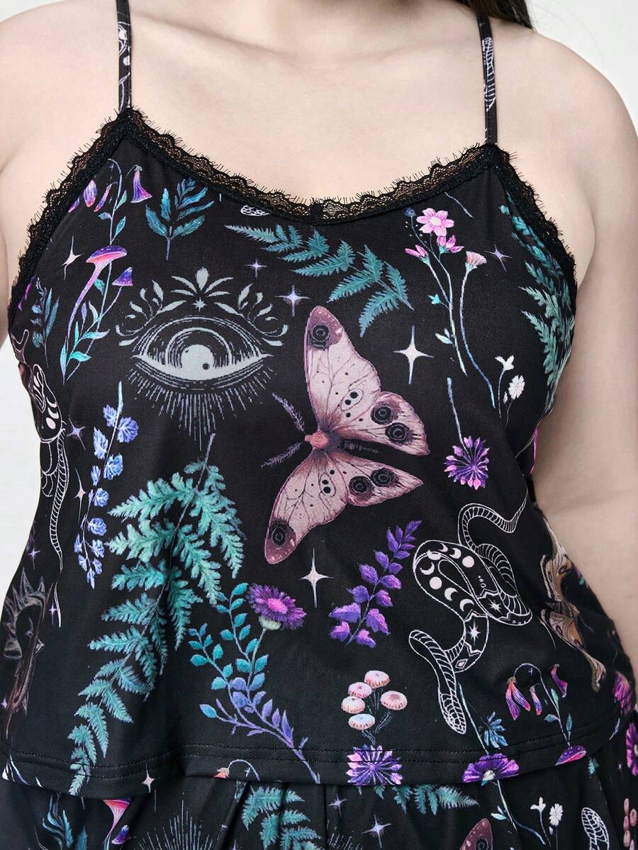 Plus Size Gothic Moth Floral Snake Plant Mushroom All-Over Print Lace Trim Satin Camisole & Shorts Pajama Set