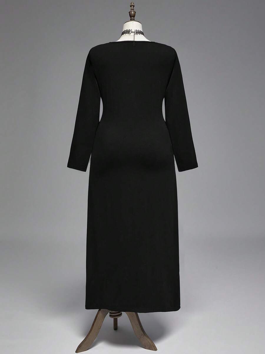 Goth Plus Size Gothic Punk Style Black Long Dress, Autumn/Winter Women's Plus Size Long Dress, Metal Rivet Side Slit Dress