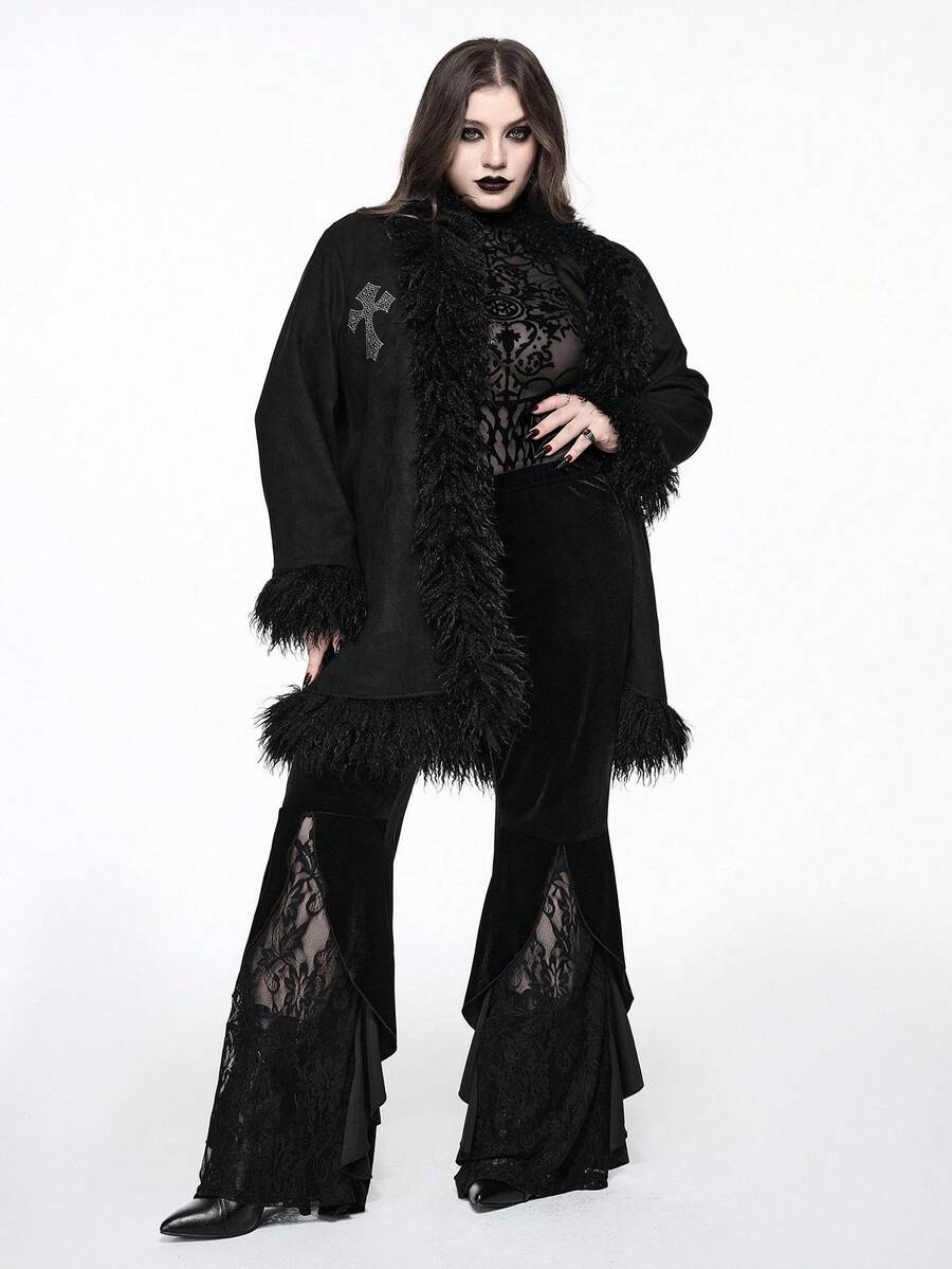 Goth Plus Size Gothic Rhinestone Cross Ostrich Fur Collar Cardigan Coat, Autumn/Winter
