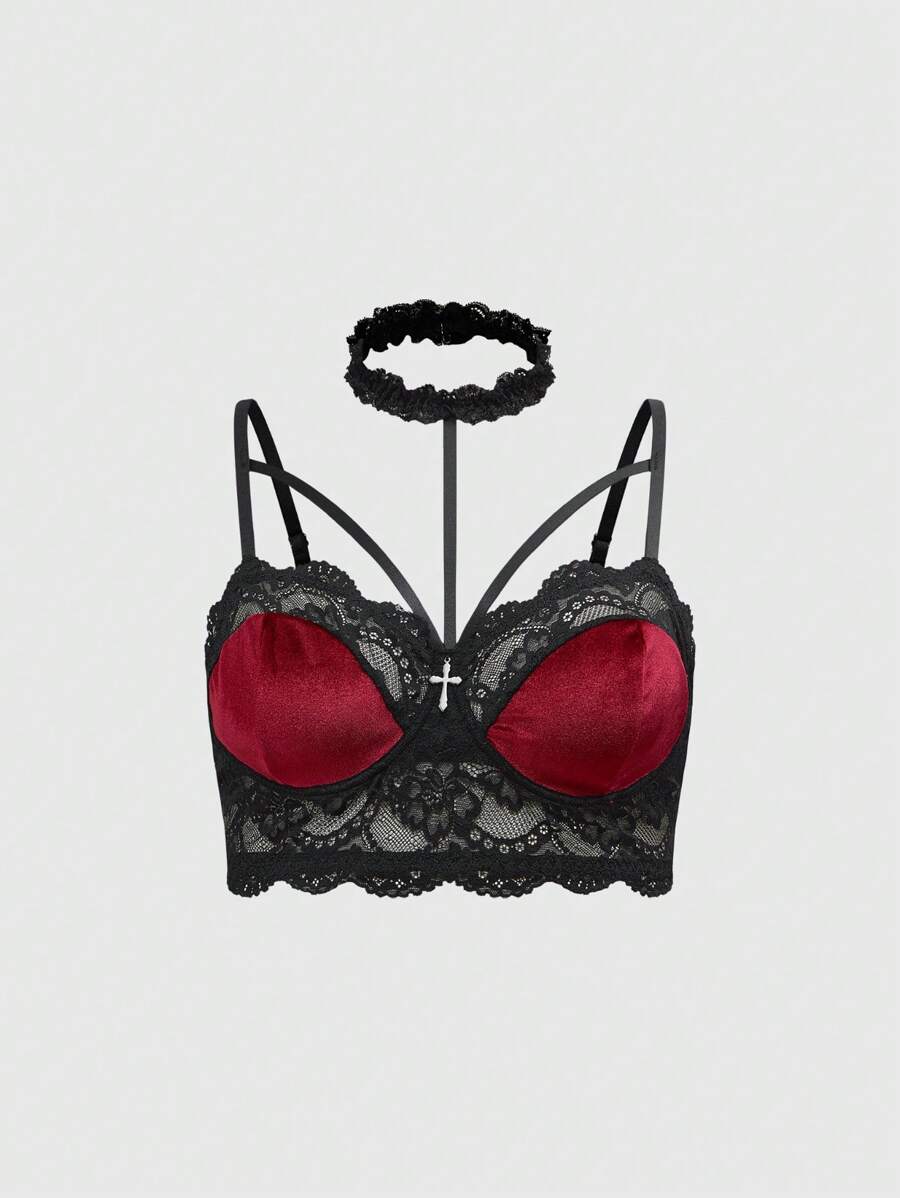 Plus Size Gothic Romantic Velvet & Lace Contrast Padded Bralette And Thong Set