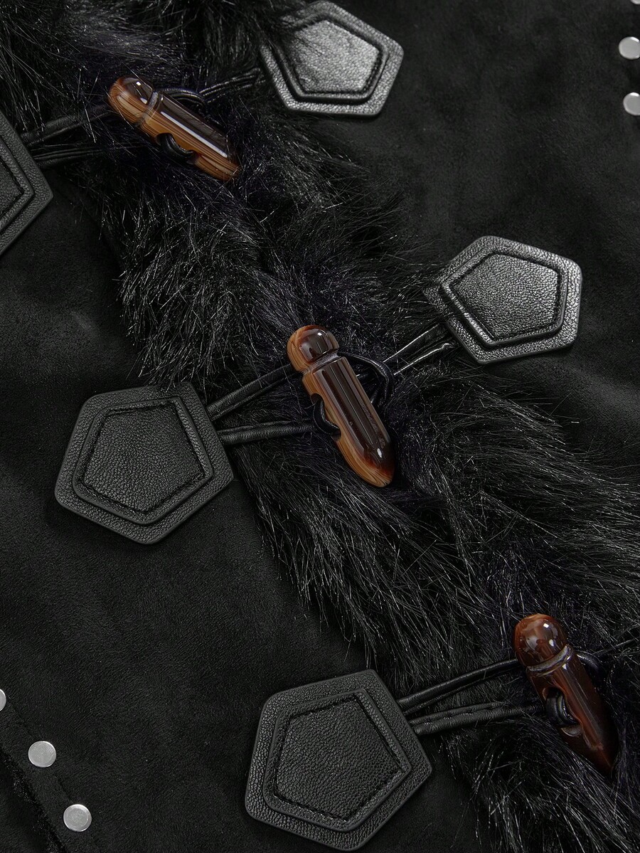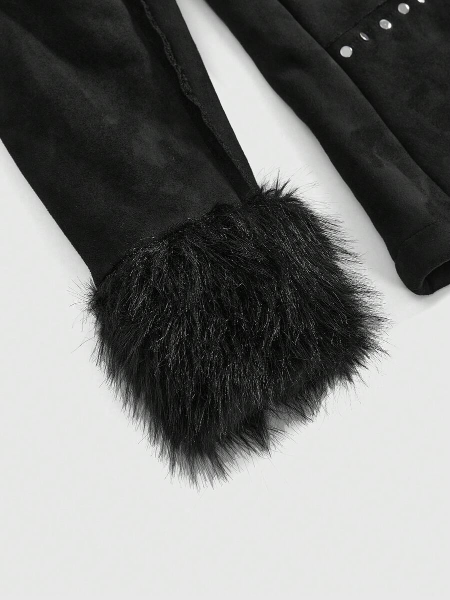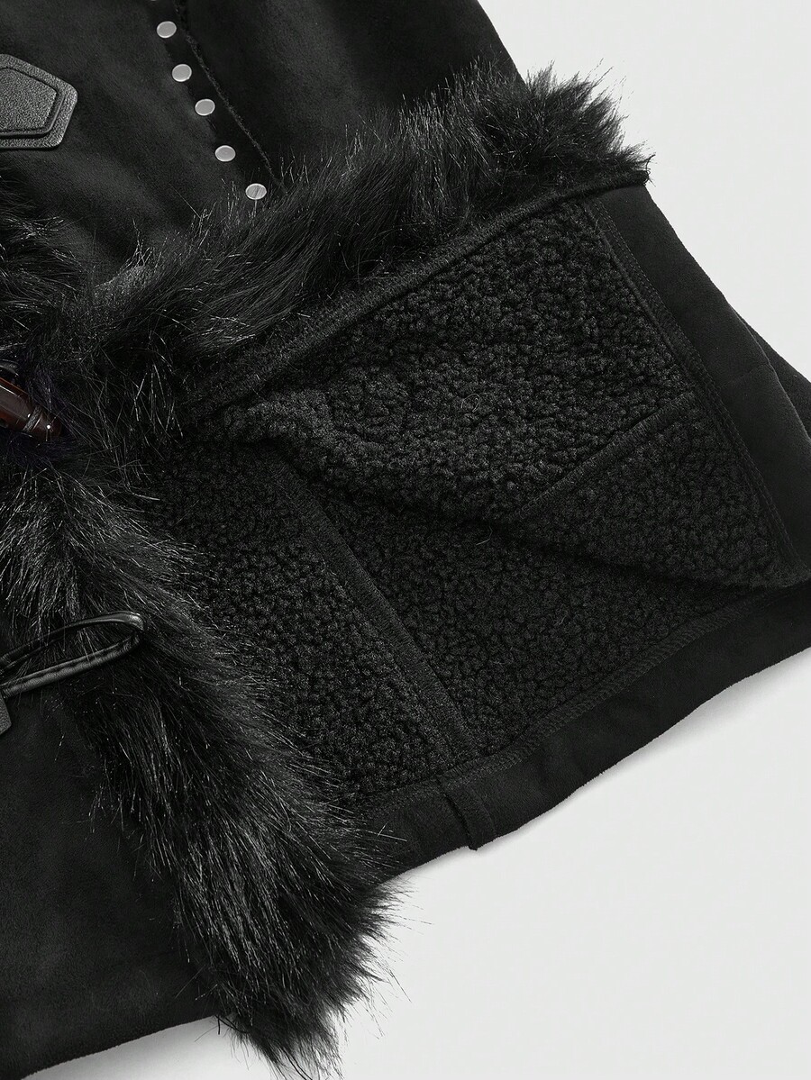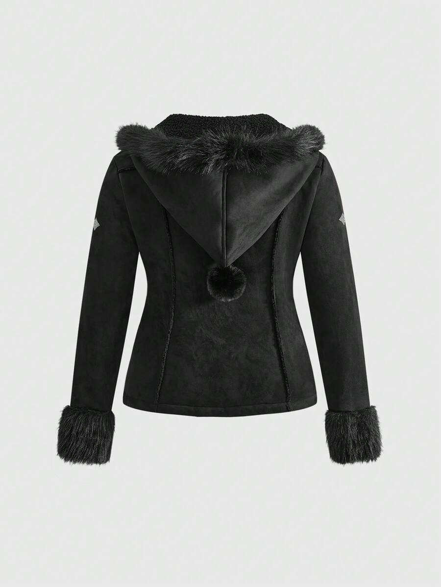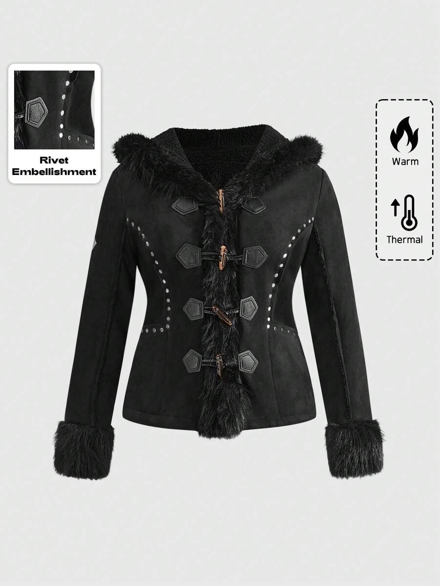 Plus Size Gothic Style Cross Rhinestone Rivet Faux Suede Hooded Jacket With Horn Buttons For Women, Black, Autumn/Winter, Casual Plus Size Women Outerwear