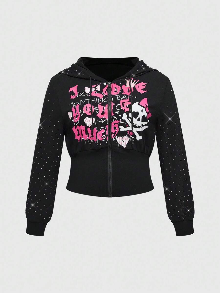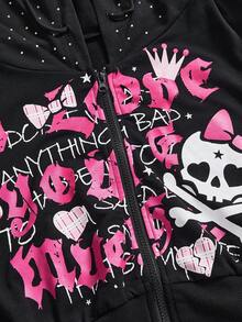 Goth Plus Size Gothic Style Pink Rhinestone Skull & Bow Letter Print Black Sweatshirt, Fashionable Streetwear Plus Size Black Hoodie Jacket For Women, Plus Size Women Long Sleeve Sweatshirt Coat, Plus Size Women Sweatshirt Sweatshirt Top/Winter