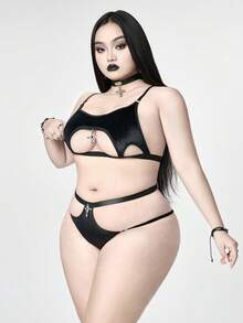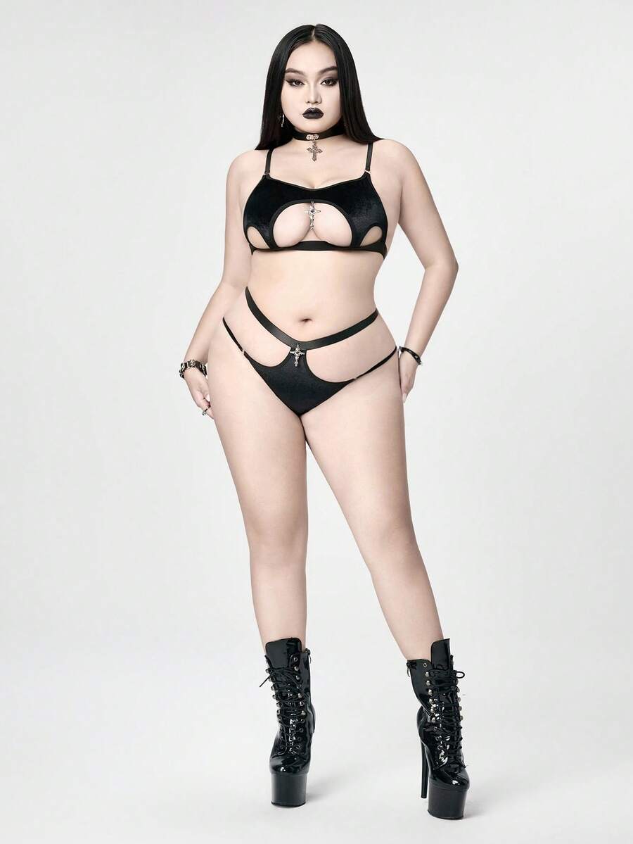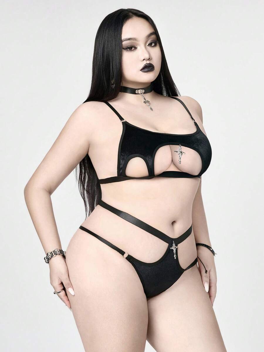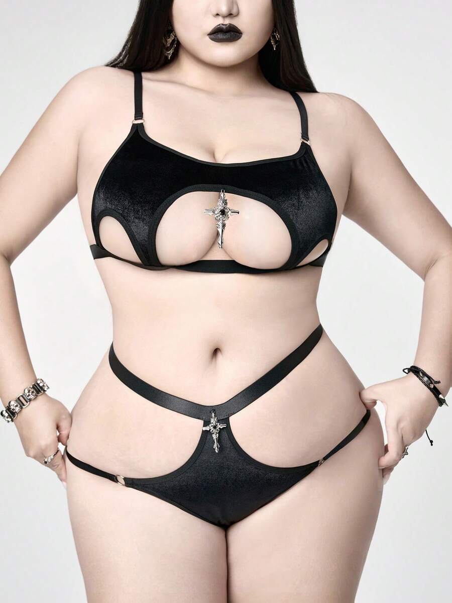 Plus Size Gothic Velvet Cross Lingerie Set, Sexy
