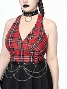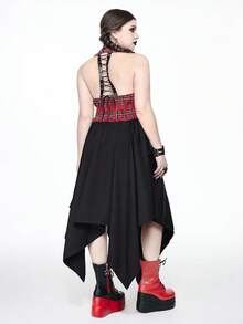 Grunge Punk Plus Size Grunge-Punk Vintage Red Plaid Patchwork Twist Bust Design Asymmetrical Hem Waist Metal Chain Dress, Autumn/Winter Plus Size Women Retro Fashion Long Dress, Halloween & Everyday Plus Size Women Dress