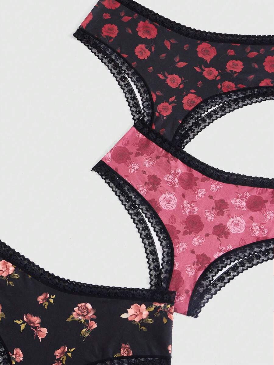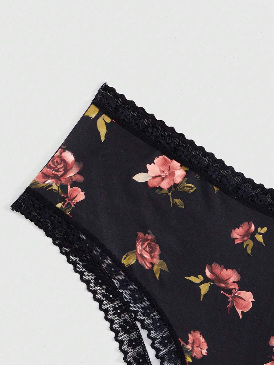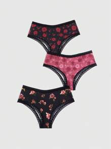 Plus Size Lace Spliced Rose & Flower Printed 3-Pack Panties