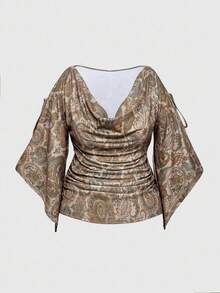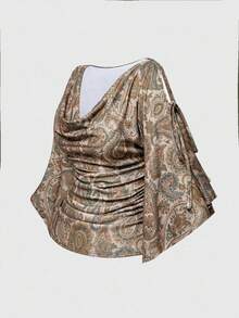 Hippie Plus Size Loose Batwing Sleeve Waist Drawstring Hippie Paisley Print T-Shirt With Wooden Bead Decor