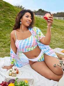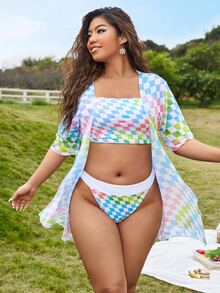 Plus Size Plaid Bikini Set With Kimono Summer Beach