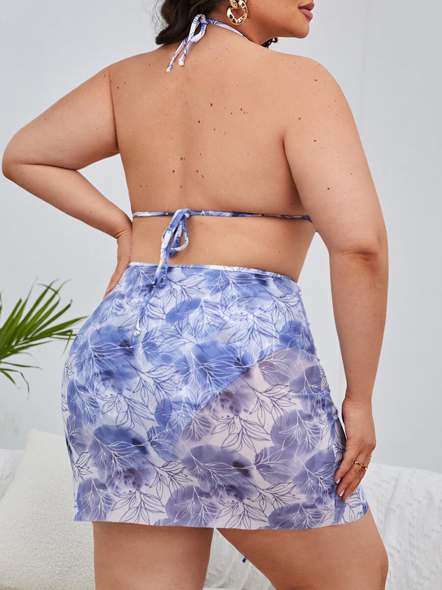 Plus Size Plant Print Bikini Set With Beach Skirt Summer Beach