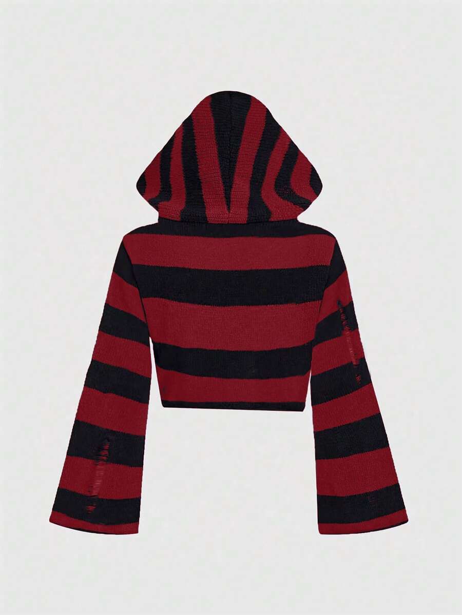 Grunge Punk Plus Size Punk Style Hooded Distressed Black & Gray Striped Cropped Sweater