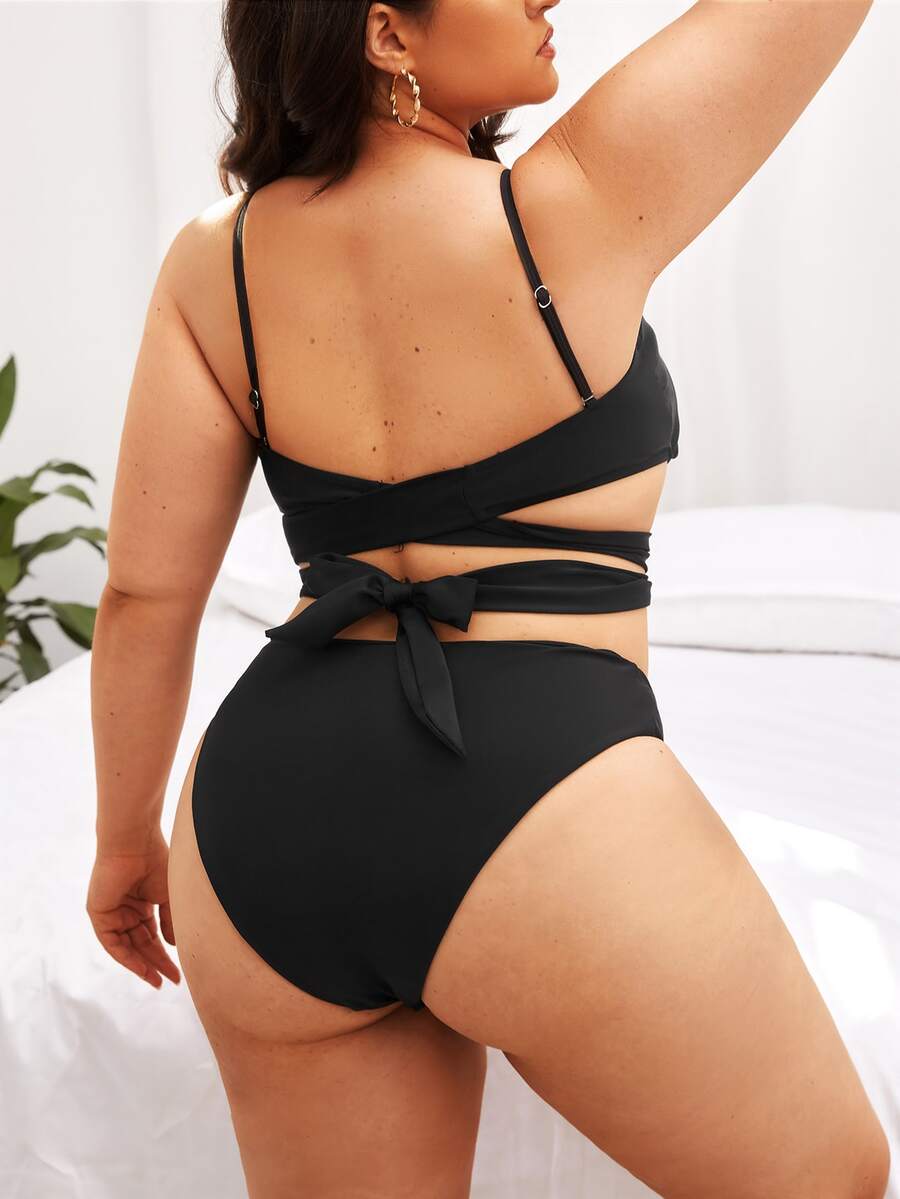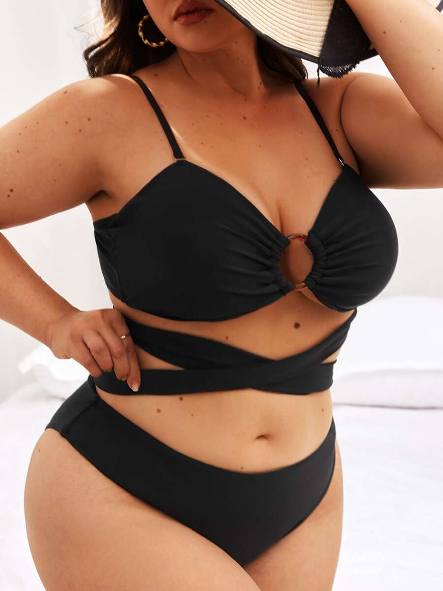 Plus Size Solid Ring Linked Lace Up Bikini Set Summer Beach