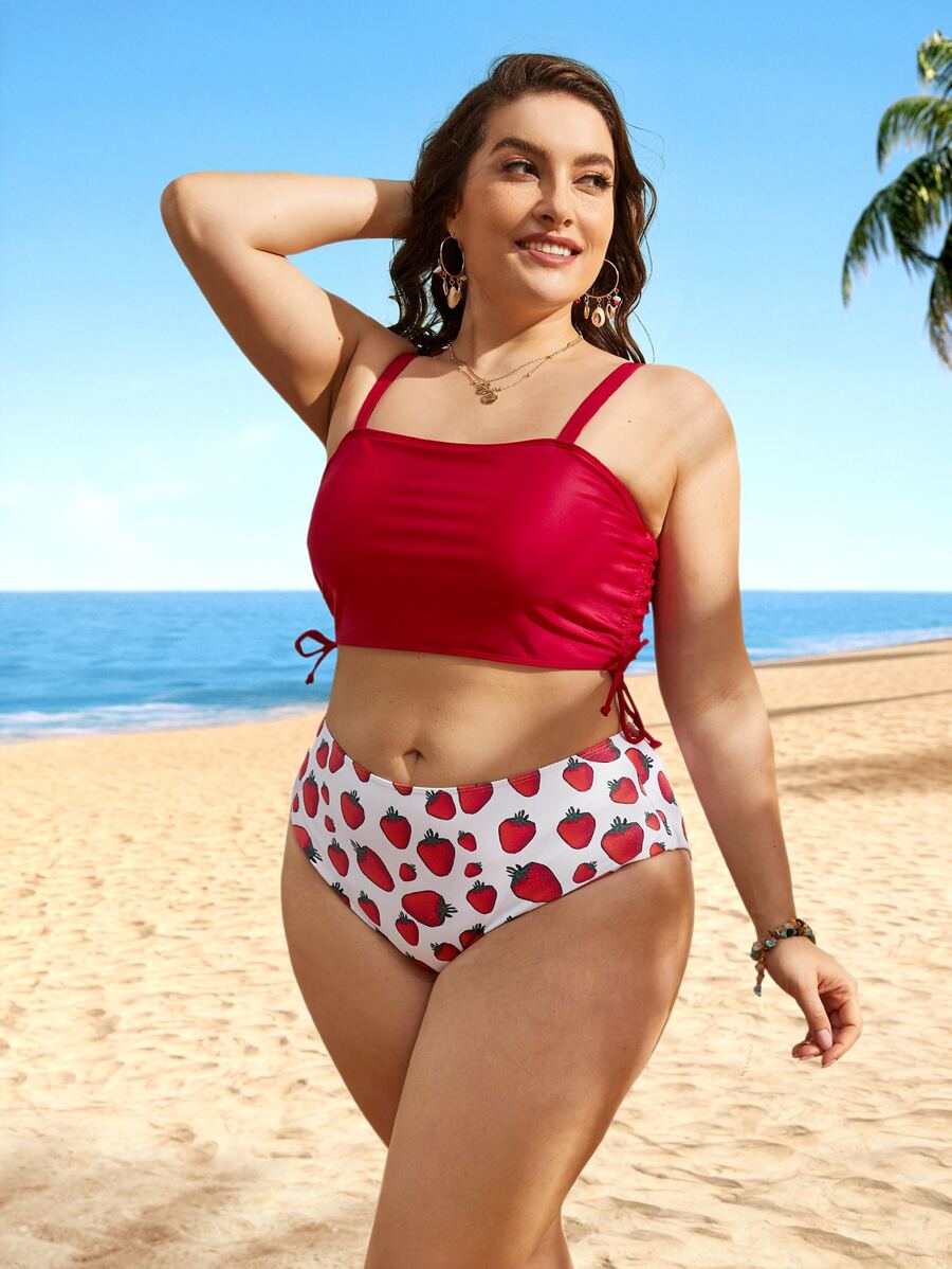 Plus Size Strawberry Print Drawstring Side Bikini Set Summer Beach