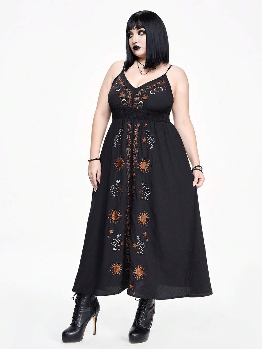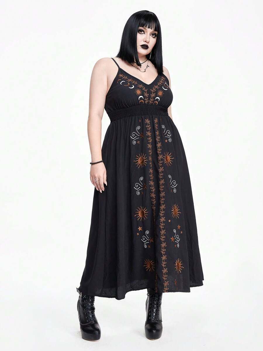 Plus Size Summer Gothic Contrast Color Star & Vine Embroidery A-Line Black Midi Dress, For Halloween