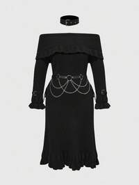 Goth Plus Size Women Gothic Retro Grunge-Punk Elegant Ruffled Collar Off-Shoulder Ruffle Sleeve Leather Strap Gothic Metal Chain Waist Belt Sweater Dress, Autumn/Winter Black Sweater Dress, Women Fashion Pullover Black Vintage Sweater Dress