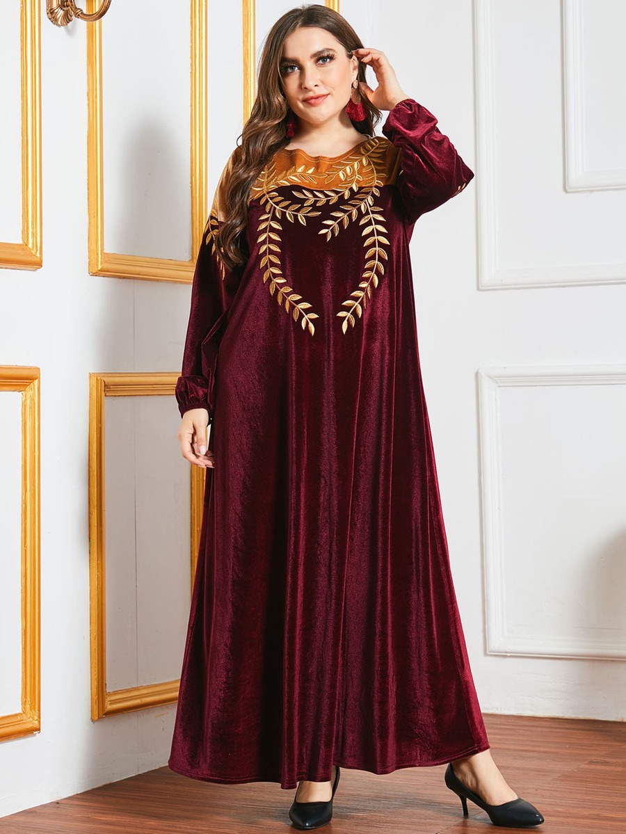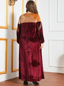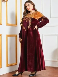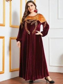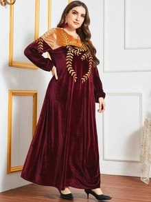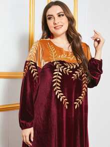 Plus Size Velvet Contrast Panel Plants Embroidery Dress