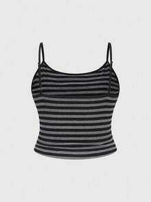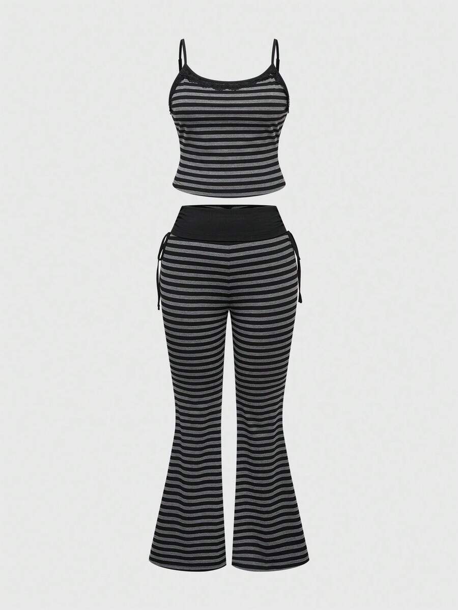 Grunge Punk Plus Size Versatile Slimming Black & Gray Striped Bell Sleeve Tank Top 2 Pieces Set