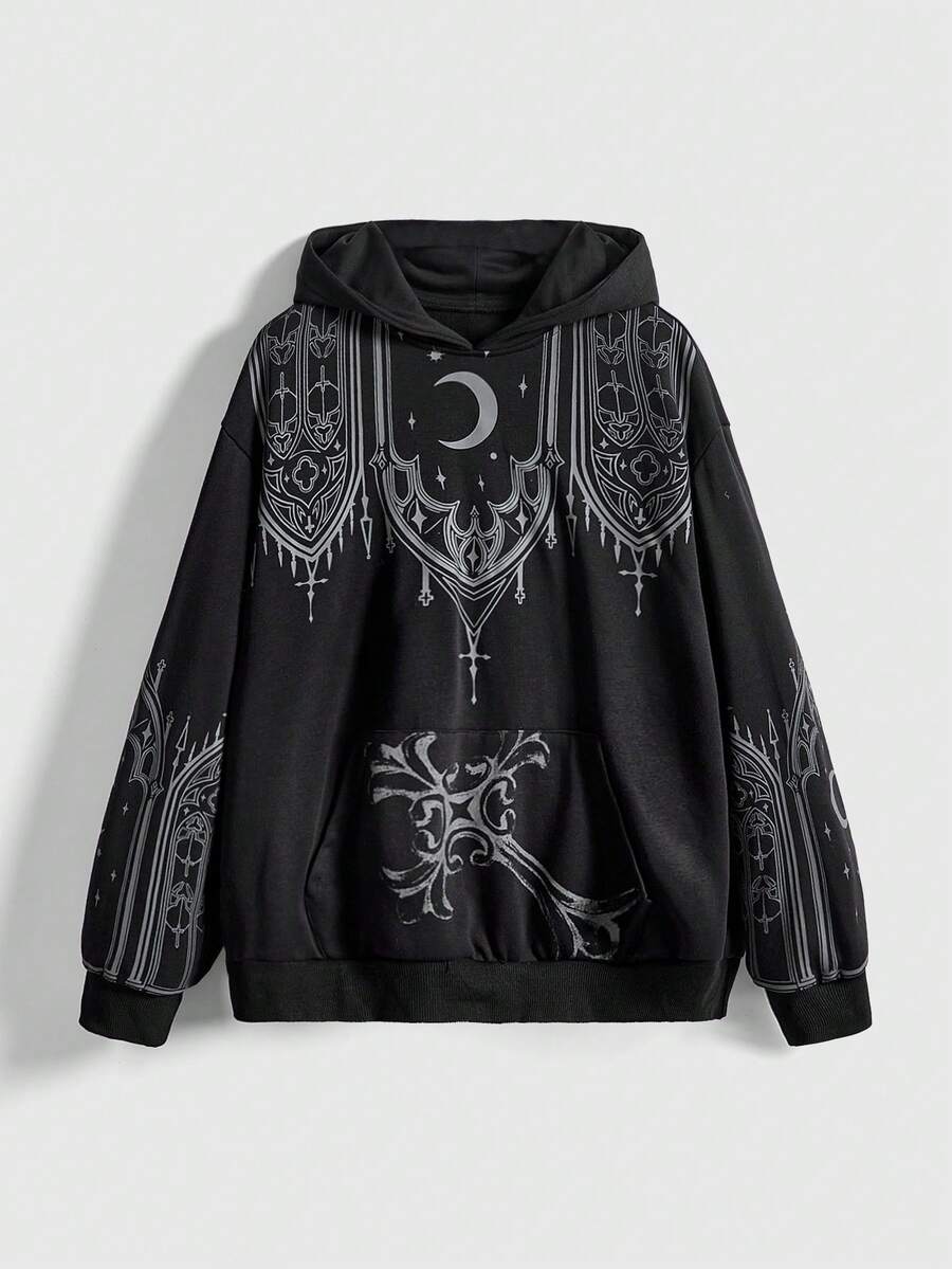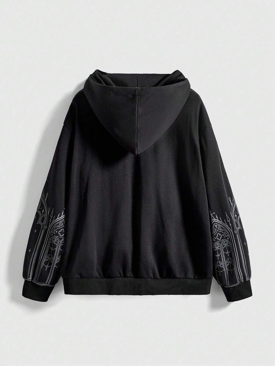 Goth Plus Size Vintage Gothic Church Cross Print Loose Open Front Long Sleeve Hoodie Sweatshirt