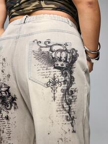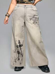 Grunge Punk Plus Size Vintage Washed Cross Print Wide Leg Jeans