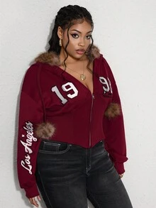 ROMWE Avant Plus Size Women's Collegiate Street Letter & Number Embroidered Furry Patchwork Drawstring Hoodie