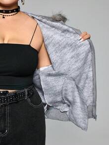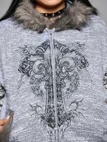 Grunge Punk Plus Size Women's Loose Sweatshirt With Punk Wing, Cross Print, Rhinestones, Gradient Striped Patchwork Fuzzy Fabric, Plus Size