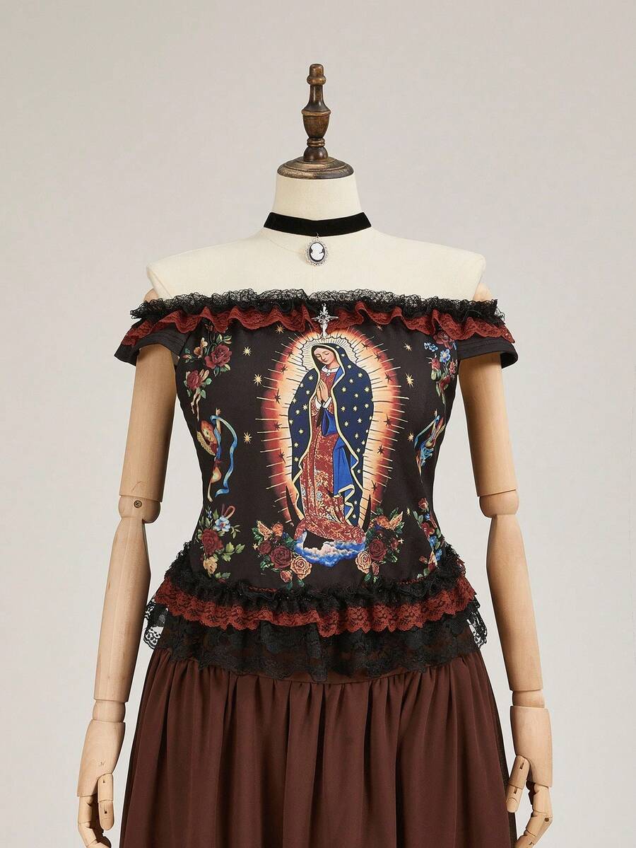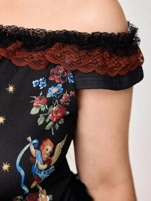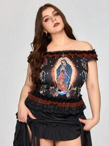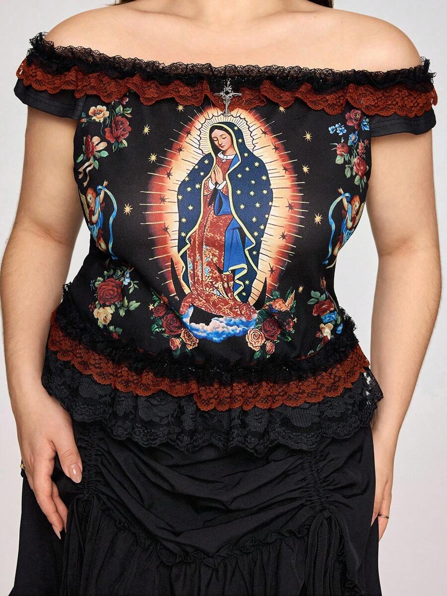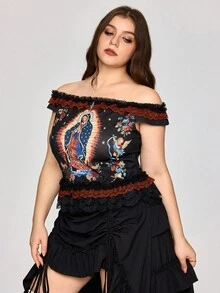 EDITION Plus Size Women's Off Shoulder Top With Dark Angel & Lace Trim Metal Decor