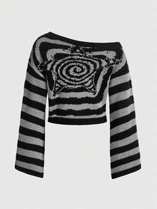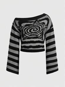 Grunge Punk Plus Size Women's Stripe & Star Textured Flare Sleeve Sweater, For Winter