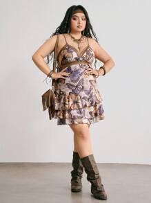 Fairycore Plus Size Women's Vintage Sexy Music Festival Butterfly Print Asymmetric Hem Delicate Bow Decor Lace Patchwork Mini Dress