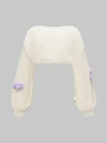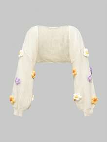 Kawaii Plus Size Women Casual Layered Cute Crochet 3D Floral Decor Lantern Sleeve Cardigan Shrug, Versatile & Lightweight For Summer