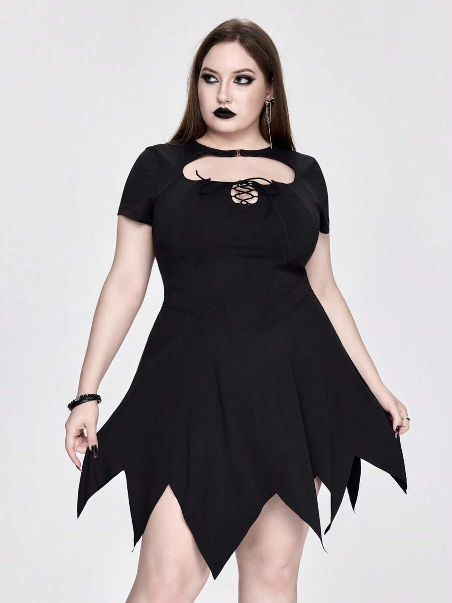 Plus Size Women Gothic Bat Collar Hollow Asymmetric Hem Beach Summer Dress